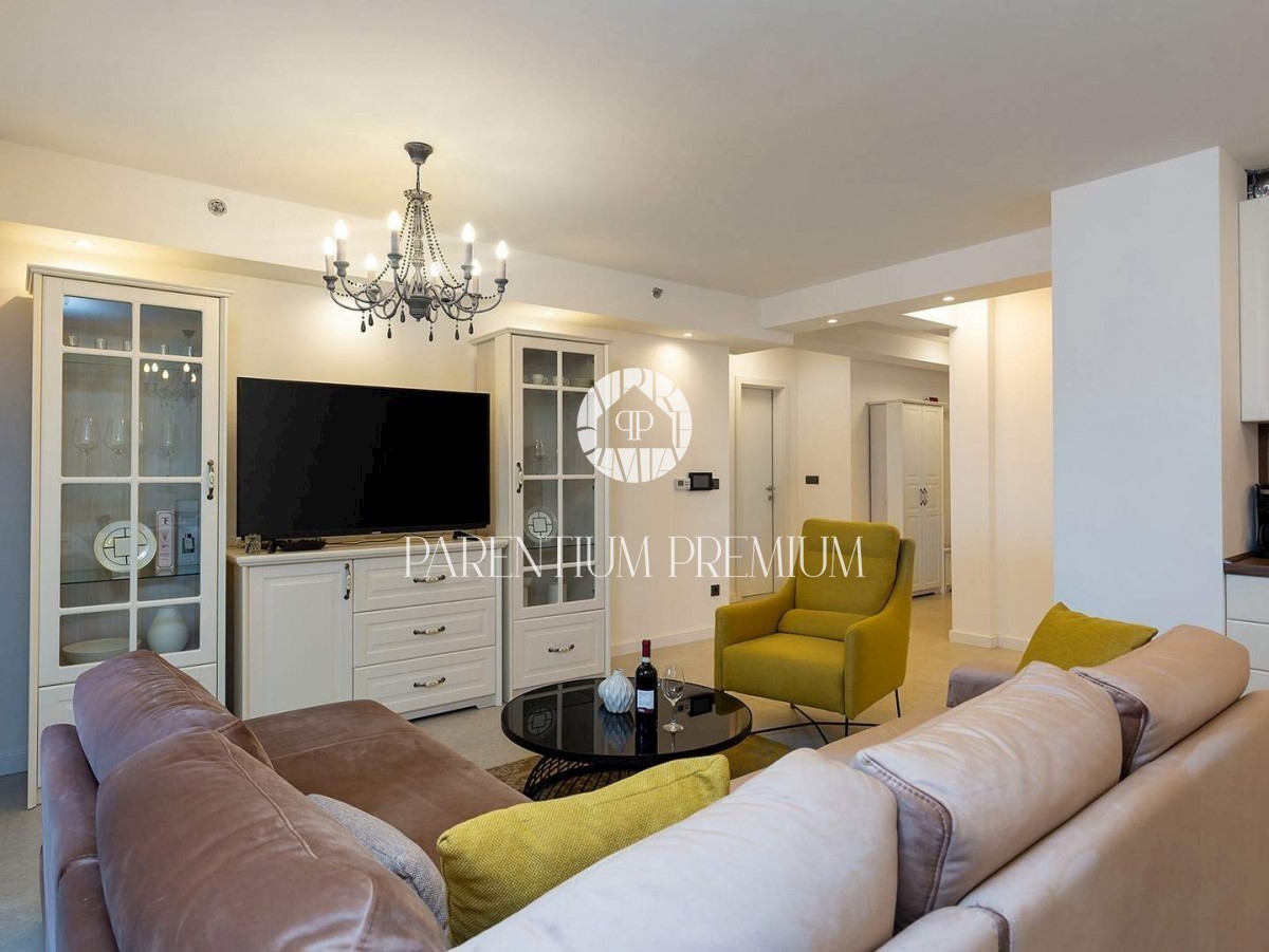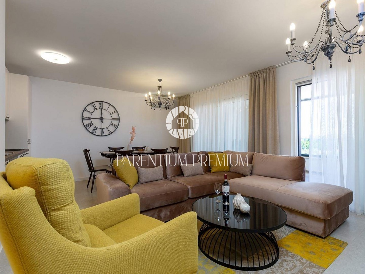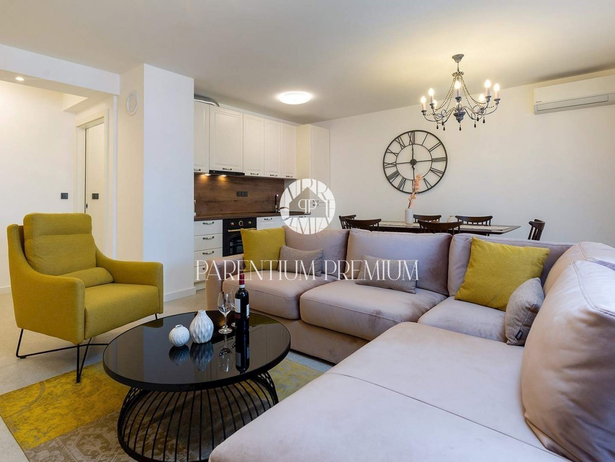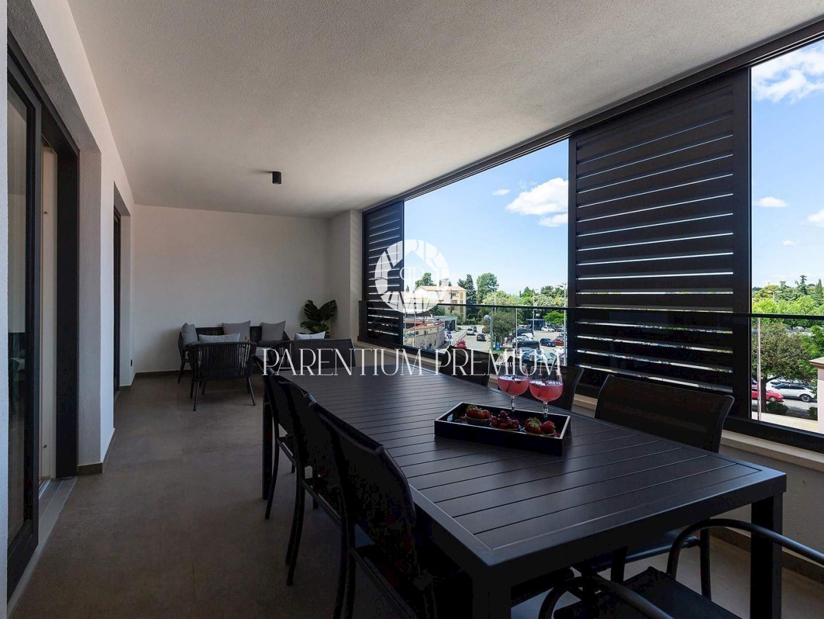 Istra, Poreč V centru mesta in v bližini čudovitih poreških plaž se prodaja to moderno in dobro opremljeno trisobno stanovanje v tretjem nadstropju ekskluzivne stavbe s pogledom na morje, dvigalom in podzemno garažo. Stanovanje obsega predsobo, kuhinjo