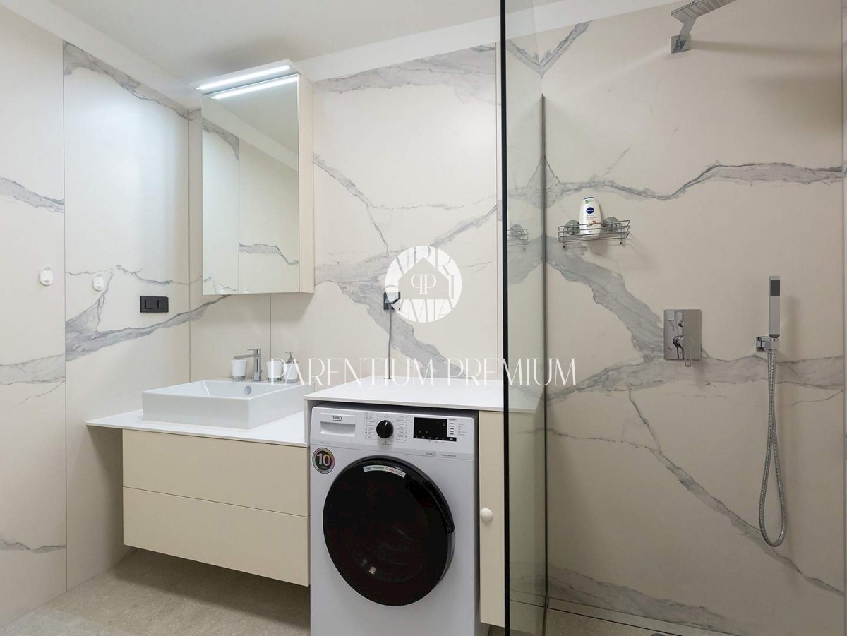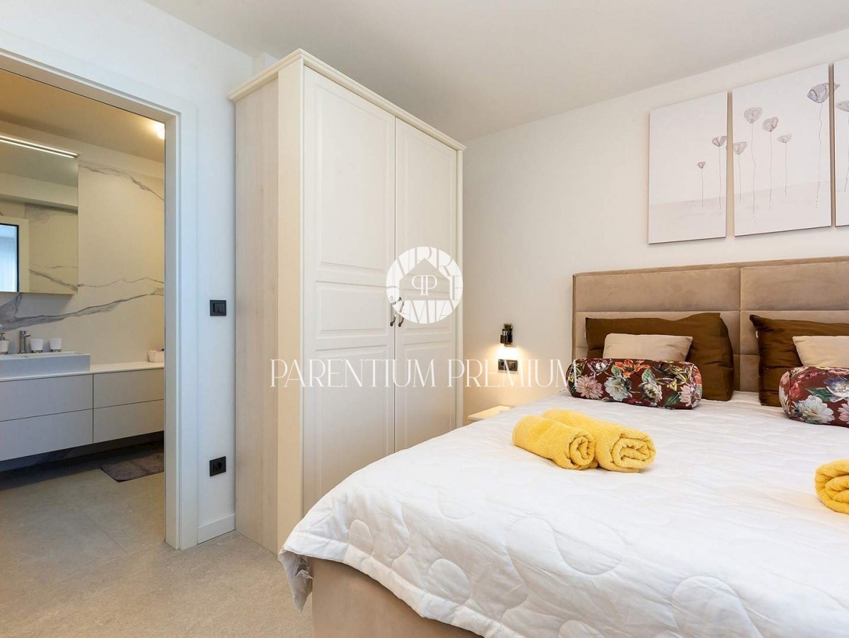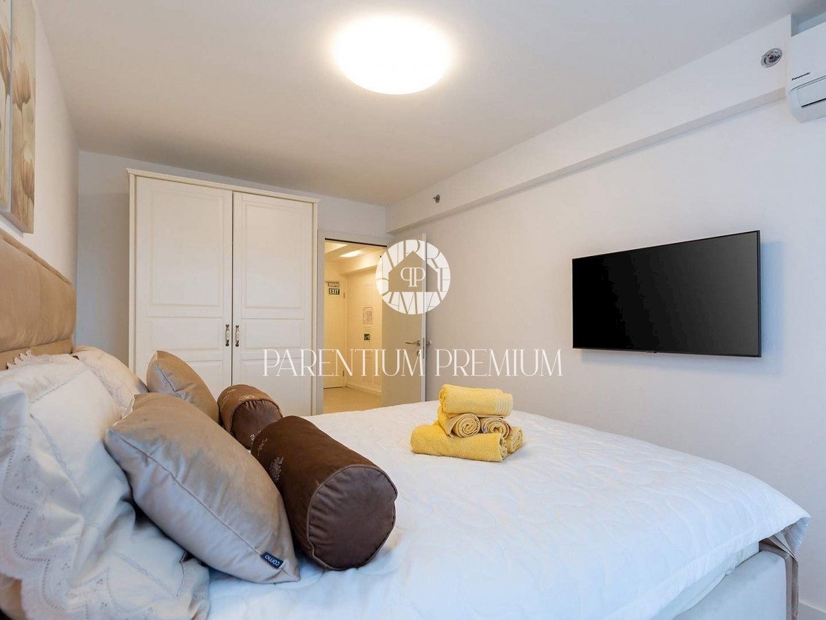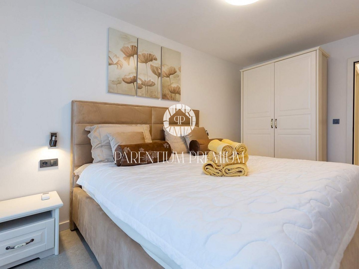 Istra, Poreč V centru mesta in v bližini čudovitih poreških plaž se prodaja to moderno in dobro opremljeno trisobno stanovanje v tretjem nadstropju ekskluzivne stavbe s pogledom na morje, dvigalom in podzemno garažo. Stanovanje obsega predsobo, kuhinjo
