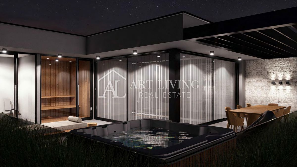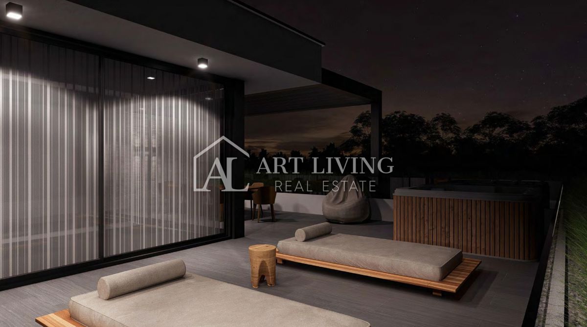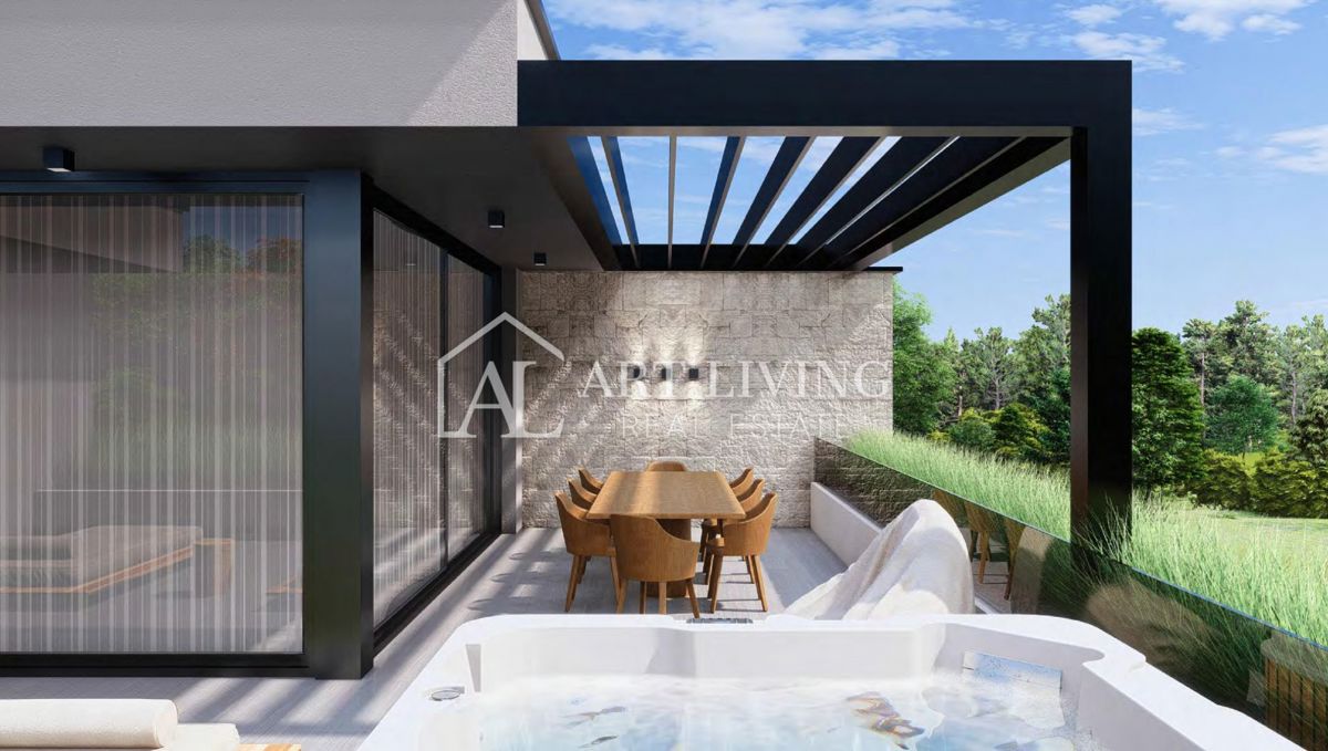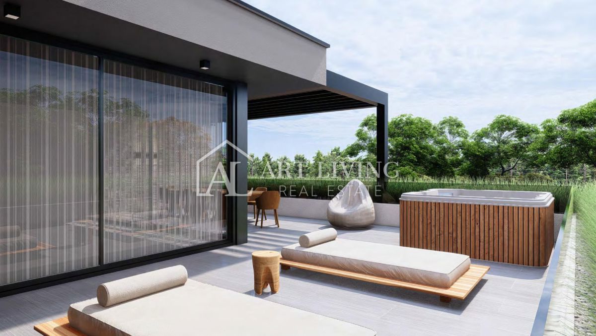 Istra, Poreč, okolica Stanovanje D Luksuzno dvonadstropno stanovanje s strešno teraso modernega dizajna je naprodaj v novi stavbi, na mirni in lepi lokaciji, le 7 km od mesta Poreč in 1,5 km od morja in urejenih plaž. Stanovanje se nahaja v prvem nadst