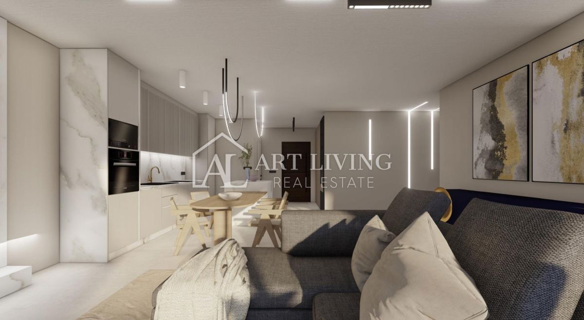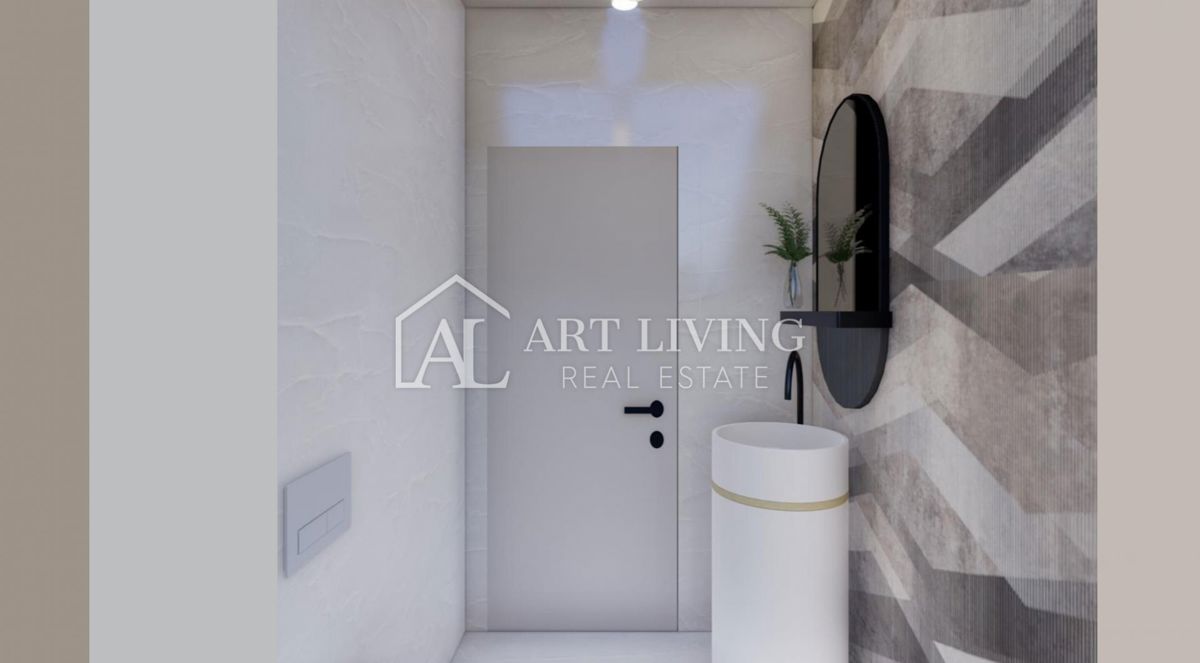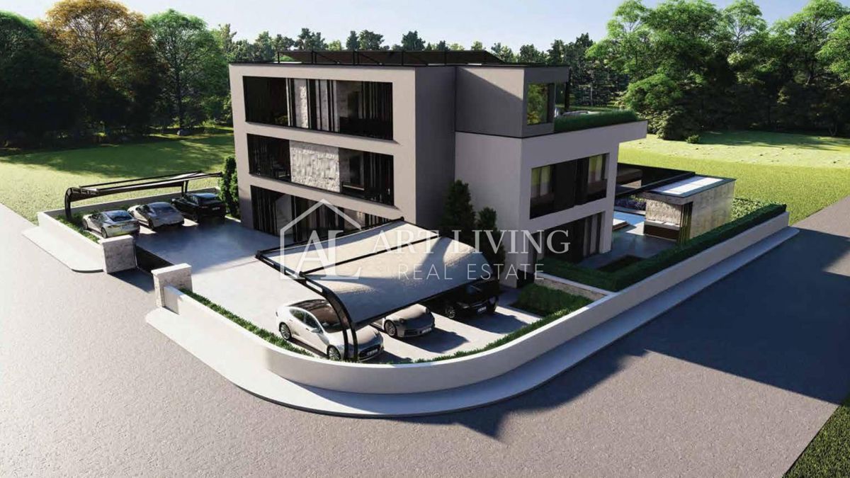 Istra, Poreč, okolica Stan A Na prodaj je luksuzno dvosobno stanovanje z bazenom modernega dizajna v novi stavbi, na mirni in lepi lokaciji, le 7 km od mesta Poreč in 1,5 km od morja in urejenih plaž. Stanovanje se nahaja v pritličju stavbe s skupno 4