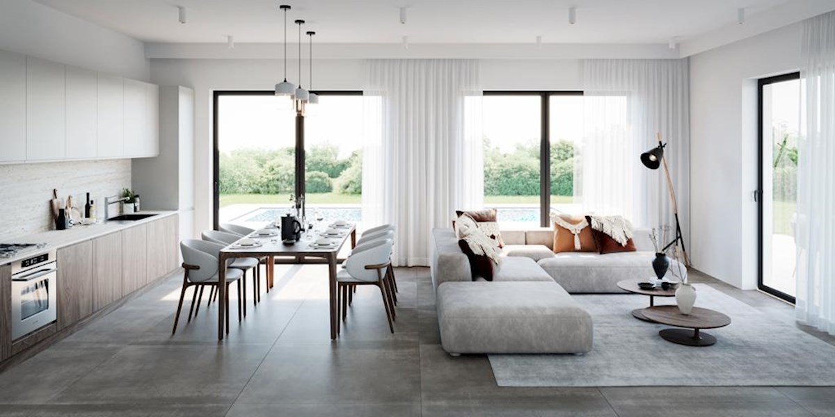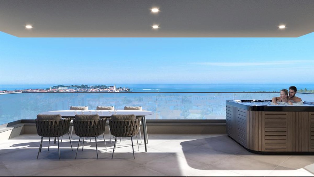 V bližini Poreča, le 3 km od morja, se prodaja to čudovito, dizajnersko opremljeno dvonadstropno stanovanje. V spodnji etaži je predprostor, ki ločuje dnevni del od spalnega. Bivalni del obsega odprto kuhinjo z jedilnico in dnevno sobo, vse s tremi izhod