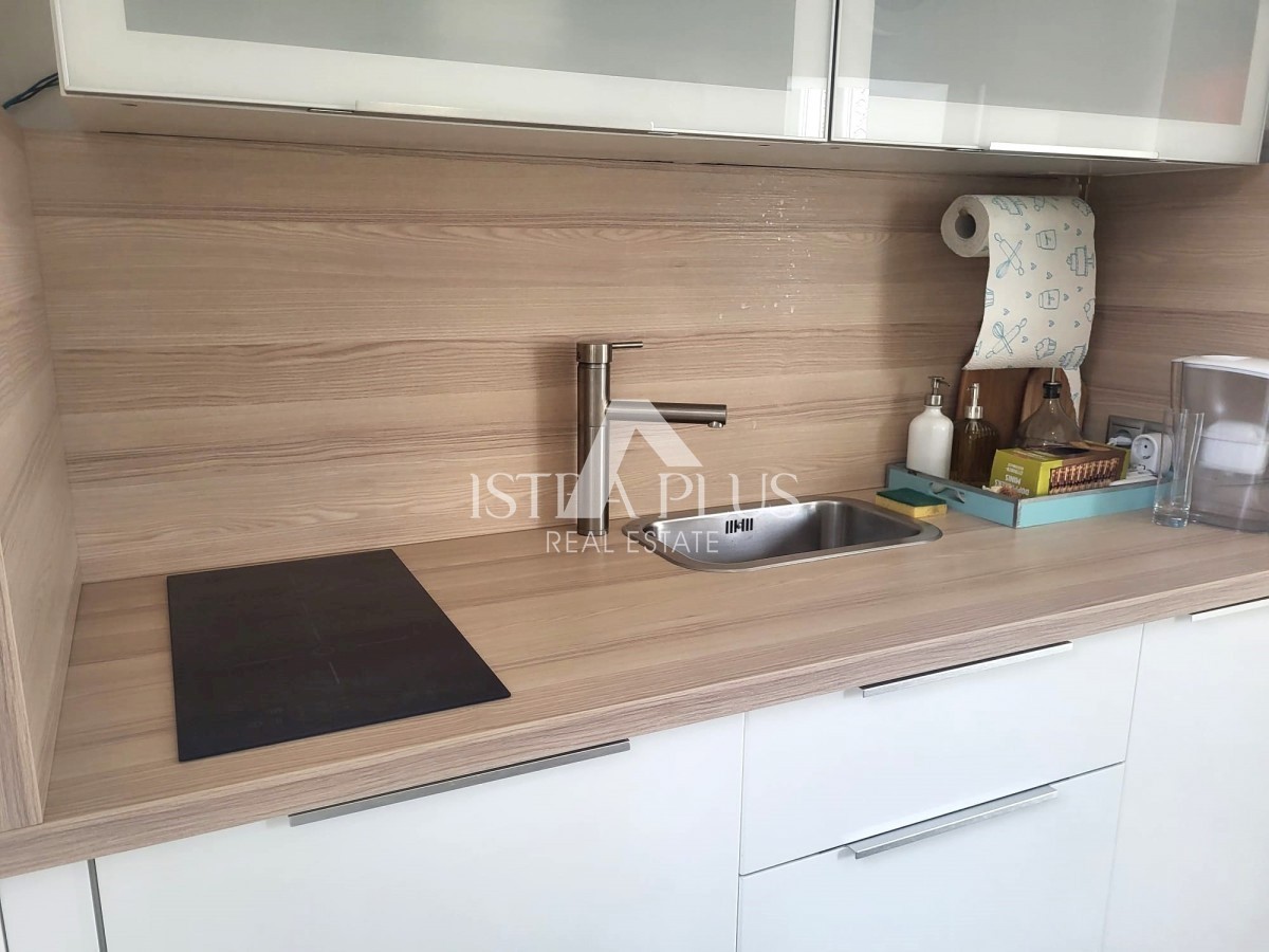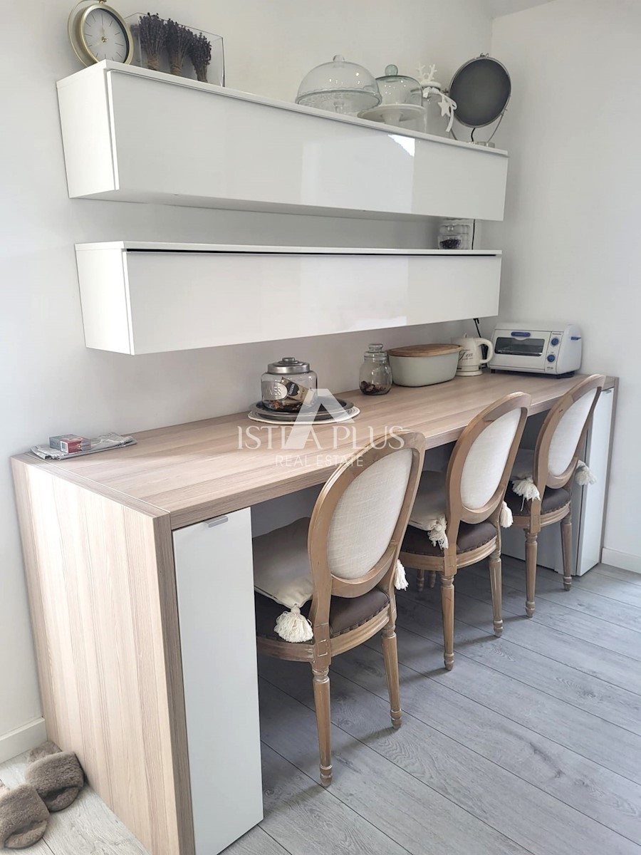 S180 Apartma 100 m od morja v Vrsarju, se nahaja v 3. nadstropju stavbe in obsega: hodnik, garderobo, kuhinjo, dnevno sobo z jedilnico in eno spalnico. pripada mu še klet v izmeri 8 m2