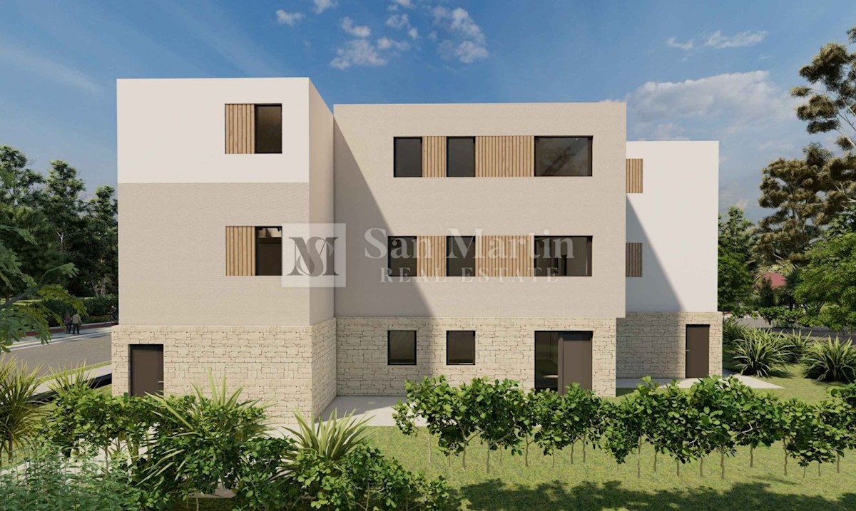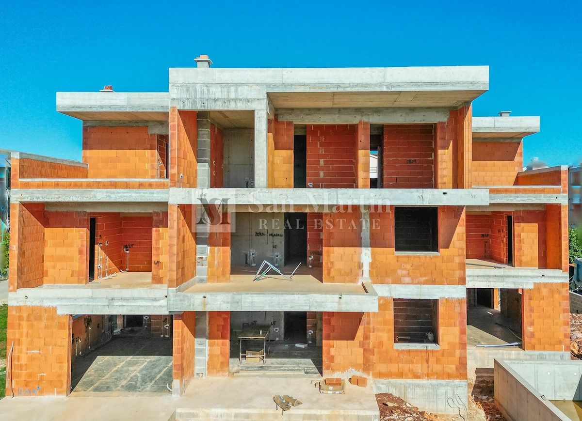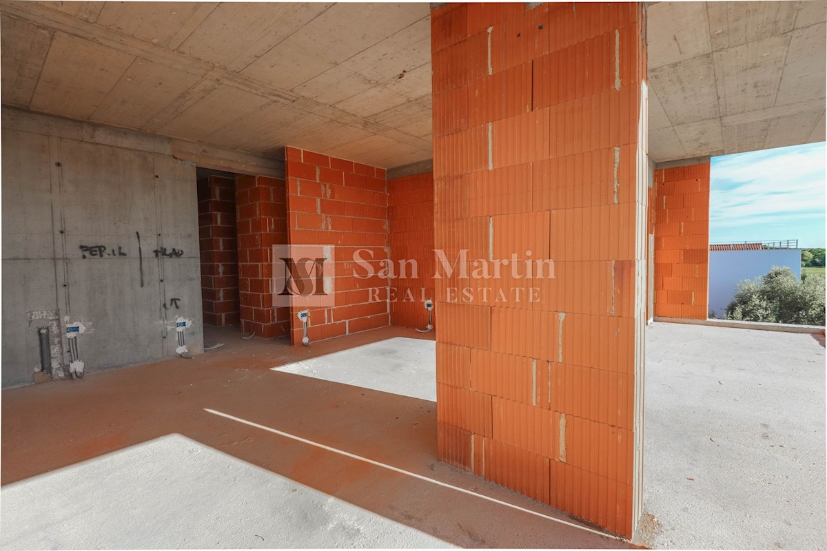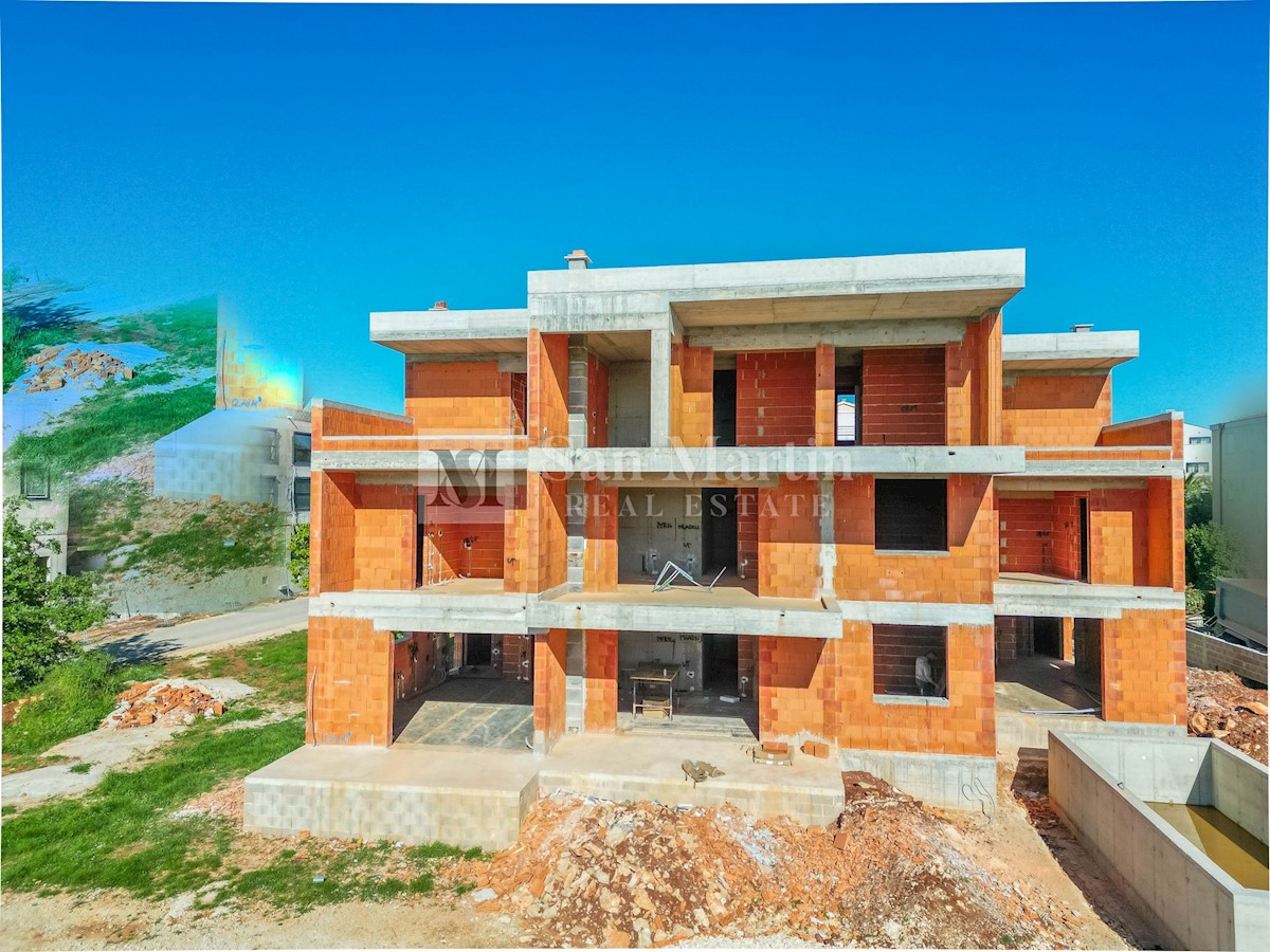 Poreč, Trisobno stanovanje s pogledom na morje v novogradnji z dvigalom Ta luksuzni apartma se nahaja nedaleč od morja in mesta Stanovanje obsega hodnik, kuhinjo, jedilnico in dnevno sobo odprtega tipa z izhodom na prostorno pokrito teraso s pogledom na