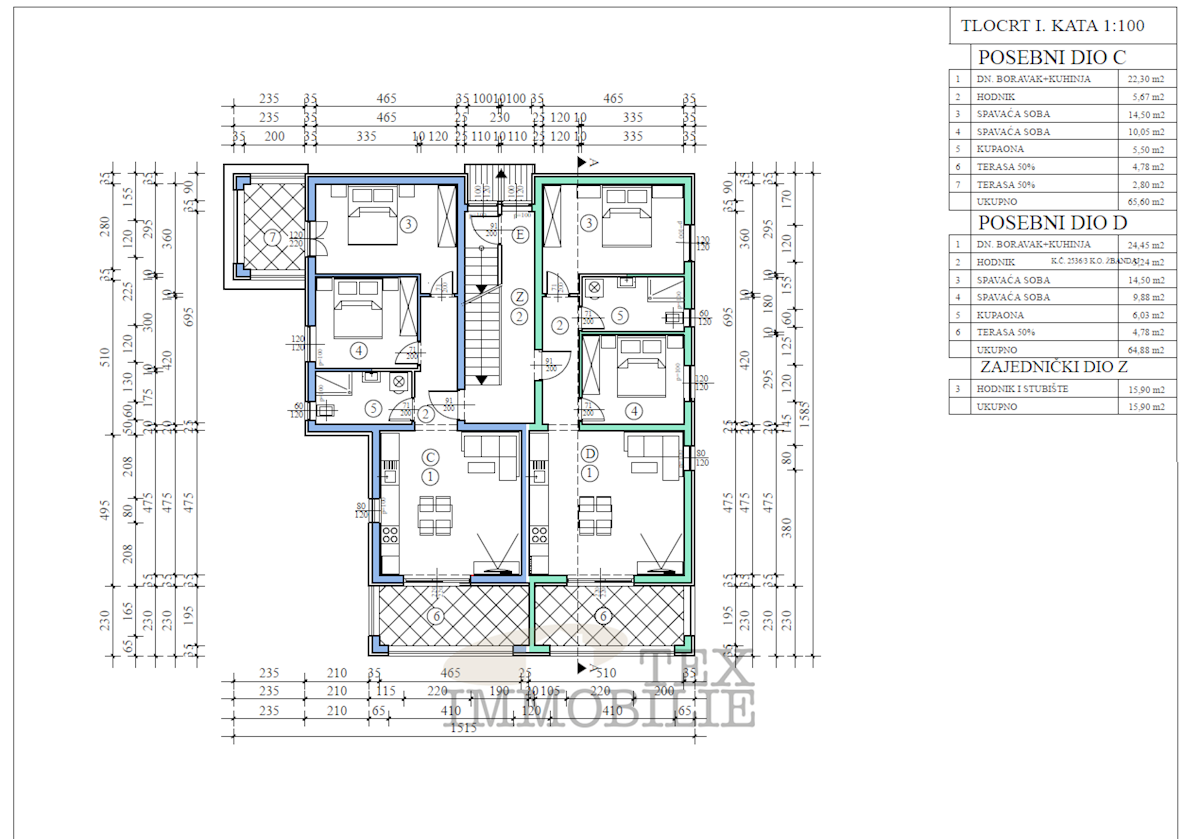 Naprodaj je moderno stanovanje z dvema spalnicama v prvem nadstropju, oddaljeno 9 kilometrov od centra Poreča in morja. Površina: 64,88 m² neto + 3,78 m² shrambe Tla: V vseh prostorih stanovanja so keramične ploščice, katerih nakupna cena je do 25 €/m²,