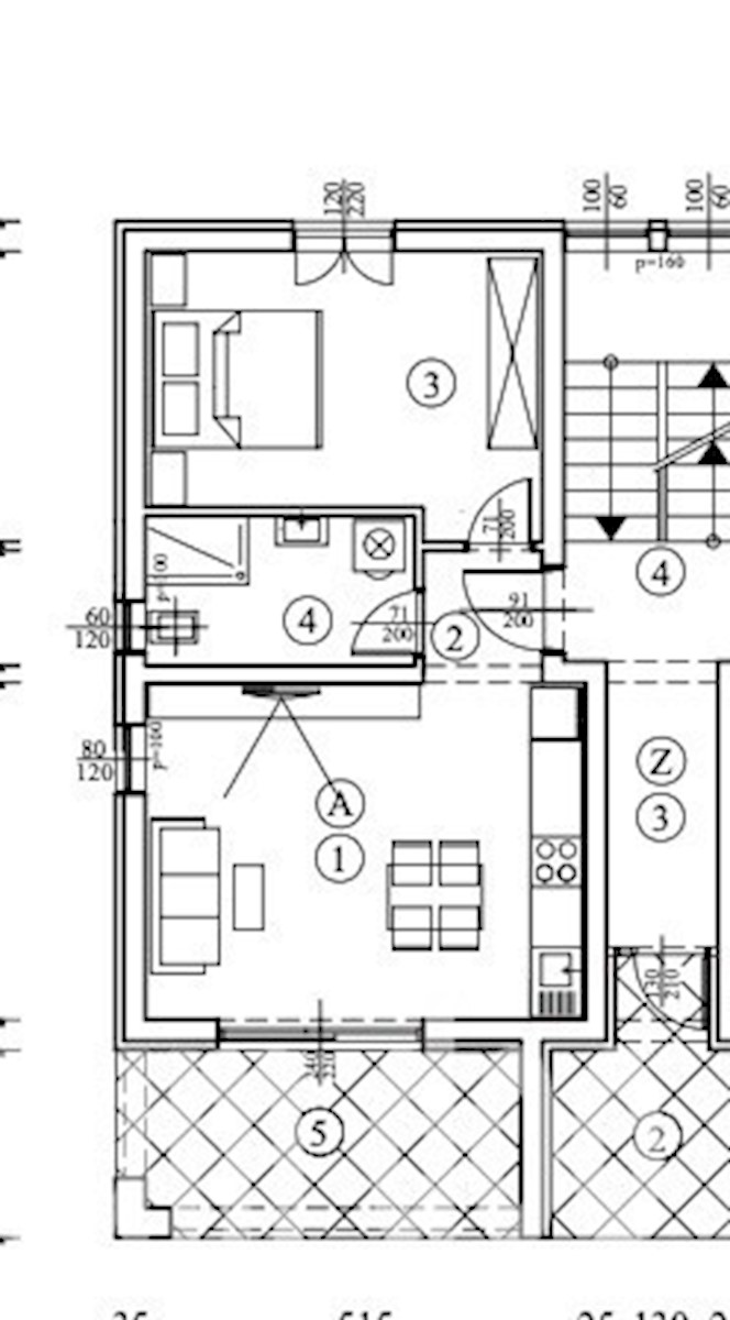 Apartma A. v pritličju z vrtom, eno spalnico, eno kopalnico, kuhinjo, dnevno sobo Vsa tla v stanovanjih so obložena s keramičnimi ploščicami z nabavno ceno do 25,00€/m2. V prostorih se polaga laminat po nabavni ceni do 25,00€/m2. Stene kopalnic in kuhinj