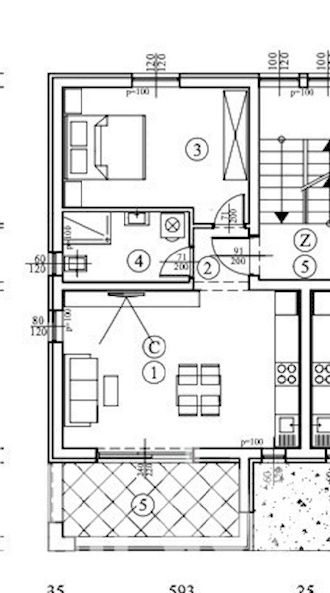 Apartma C v prvem nadstropju, ena spalnica, ena kopalnica, kuhinja, dnevna soba OPIS STANOVANJ -------------------------------------------------- -------------------------------------------------- -------------------- Vsa tla v stanovanjih so obložena s