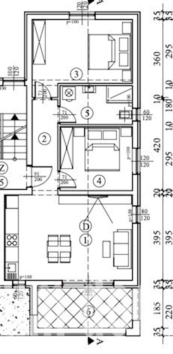 Apartma D. v prvem nadstropju, dve spalnici, ena kopalnica, dnevna soba, kuhinja OPIS STANOVANJ -------------------------------------------------- -------------------------------------------------- -------------------- Vsa tla v stanovanjih so obložena s