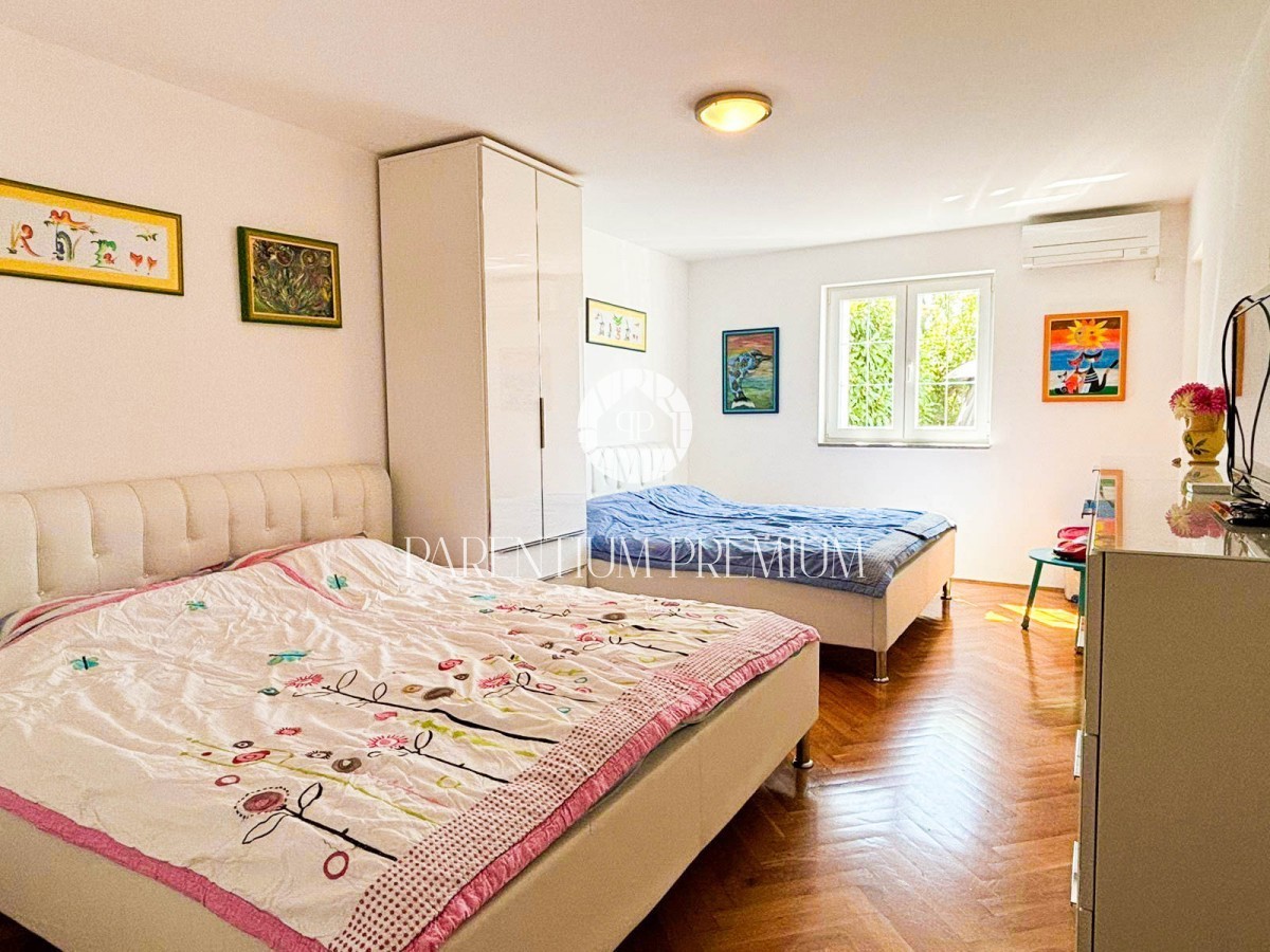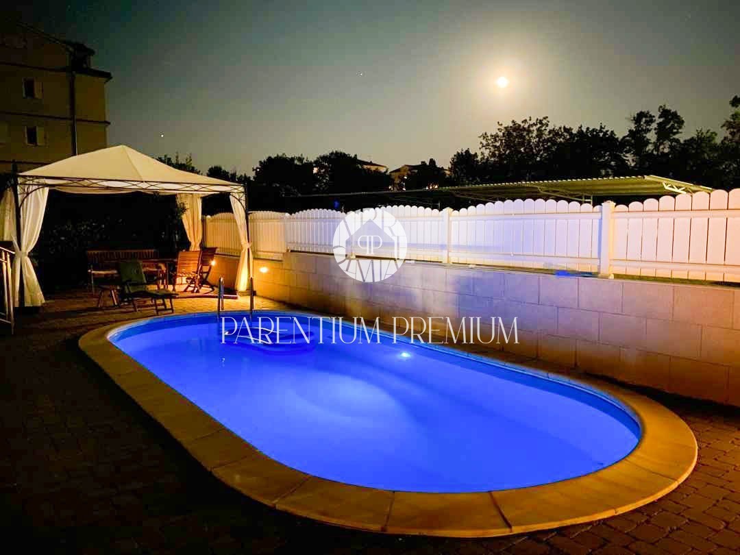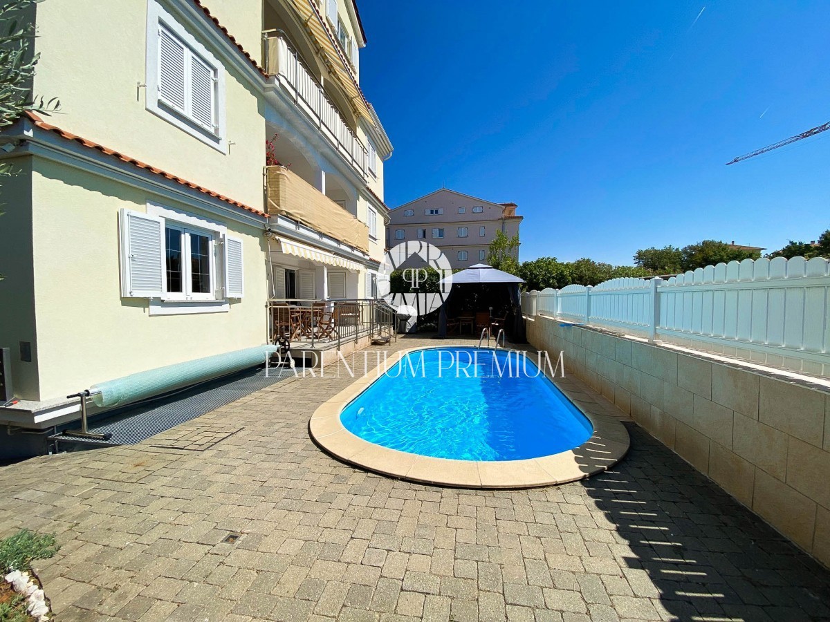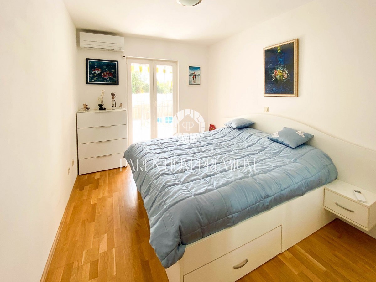 Istra, Poreč - 900m od morja Na lepi in atraktivni lokaciji 900 m od morja in prvih plaž se nahaja to čudovito stanovanje s skupno površino 94,75 m2 z vrtom 150 m2 in bazenom 21 m2. Stanovanje obsega dnevno sobo, ločeno kuhinjo, 2 veliki spalnici, 2 kop