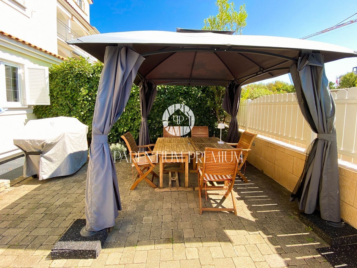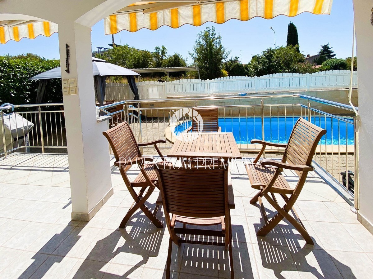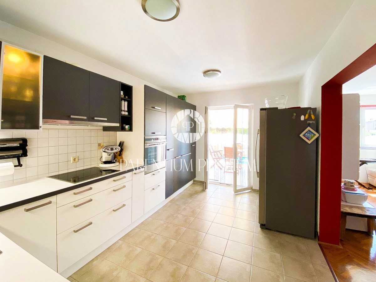 Istra, Poreč - 900m od morja Na lepi in atraktivni lokaciji 900 m od morja in prvih plaž se nahaja to čudovito stanovanje s skupno površino 94,75 m2 z vrtom 150 m2 in bazenom 21 m2. Stanovanje obsega dnevno sobo, ločeno kuhinjo, 2 veliki spalnici, 2 kop