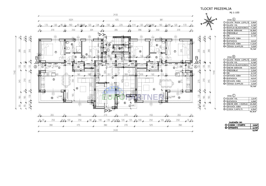 Predstavljamo vam moderni trosoban stan, smješten u prizemlju zgrade, ukupne površine 76,19 m2, u prekrasnom Poreču. Zgrada je trenutno u fazi izgradnje, a završetak izgradnje se očekuje u proljeće 2025. godine. Stan se prostire na dvije spavaće sobe s