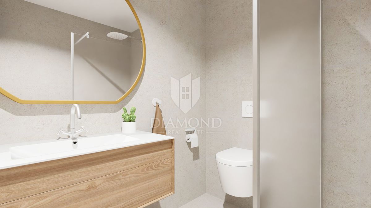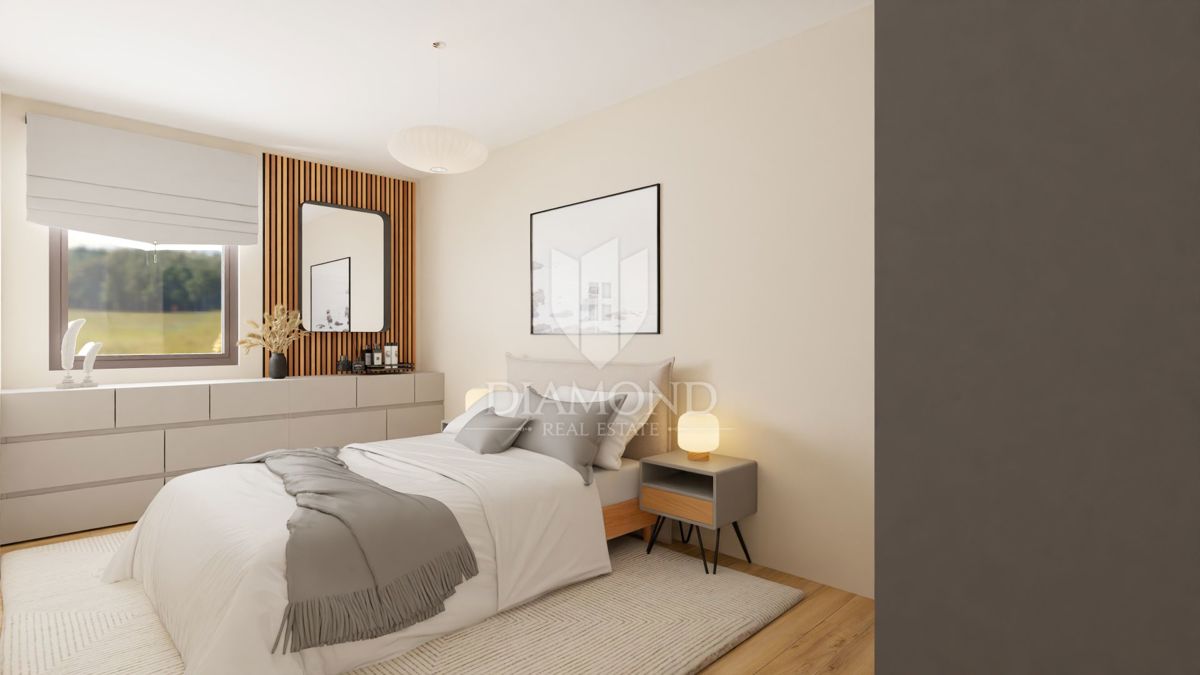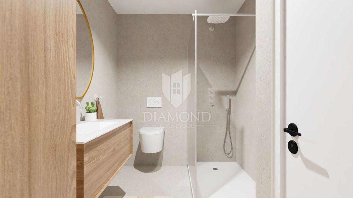 Poreč, okolica, enosobno stanovanje v drugem nadstropju nedaleč od morja! Ta sodoben stanovanjski objekt s skupno 23 stanovanji se bo nahajal nedaleč od mesta Poreč, le 8 km stran. Stanovanje se nahaja v drugem nadstropju in ima skupno 52,56 m2. Sestoji
