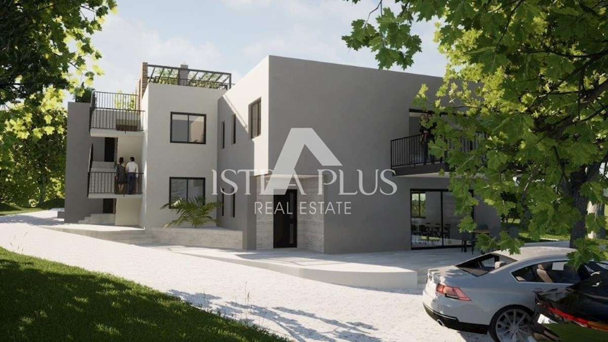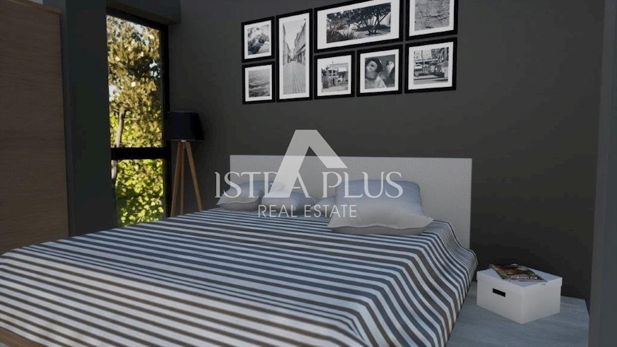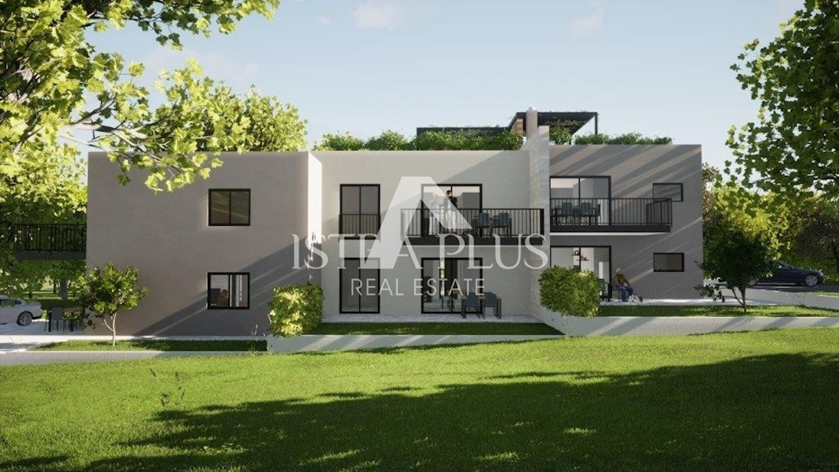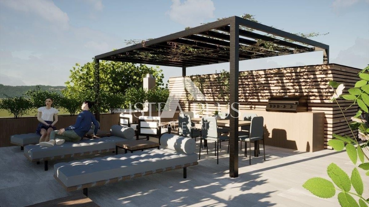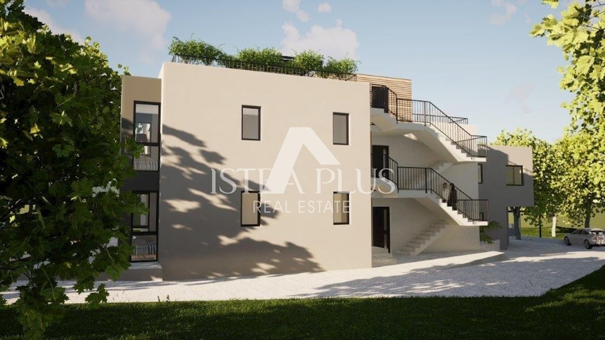 S05 Lep projekt v bližini Poreča, Vsako stanovanje ima ločen vhod in parkirno mesto Apartma 5 se nahaja v 1. nadstropju, komfortne površine 83,80 m2, obsega: hodnik, WC, kopalnico, dnevno sobo, kuhinjo in jedilnico, izhod na balkon, ter strešno teraso s