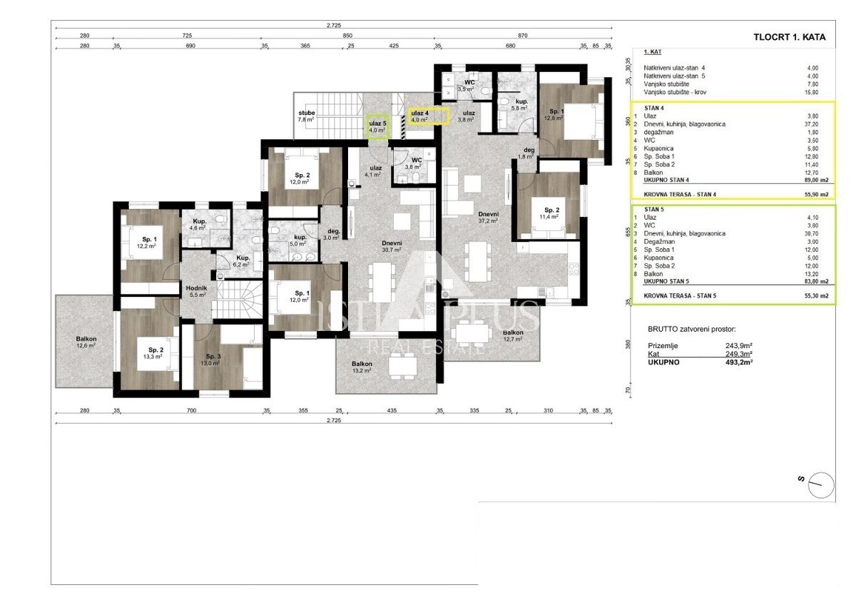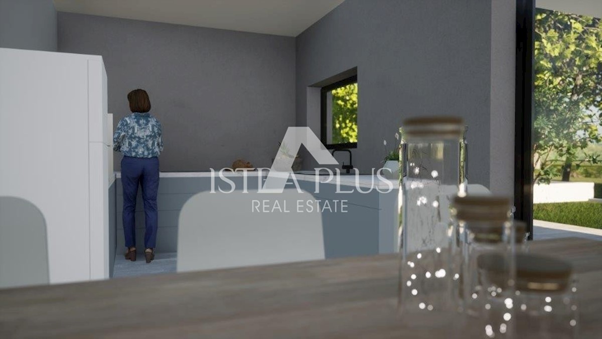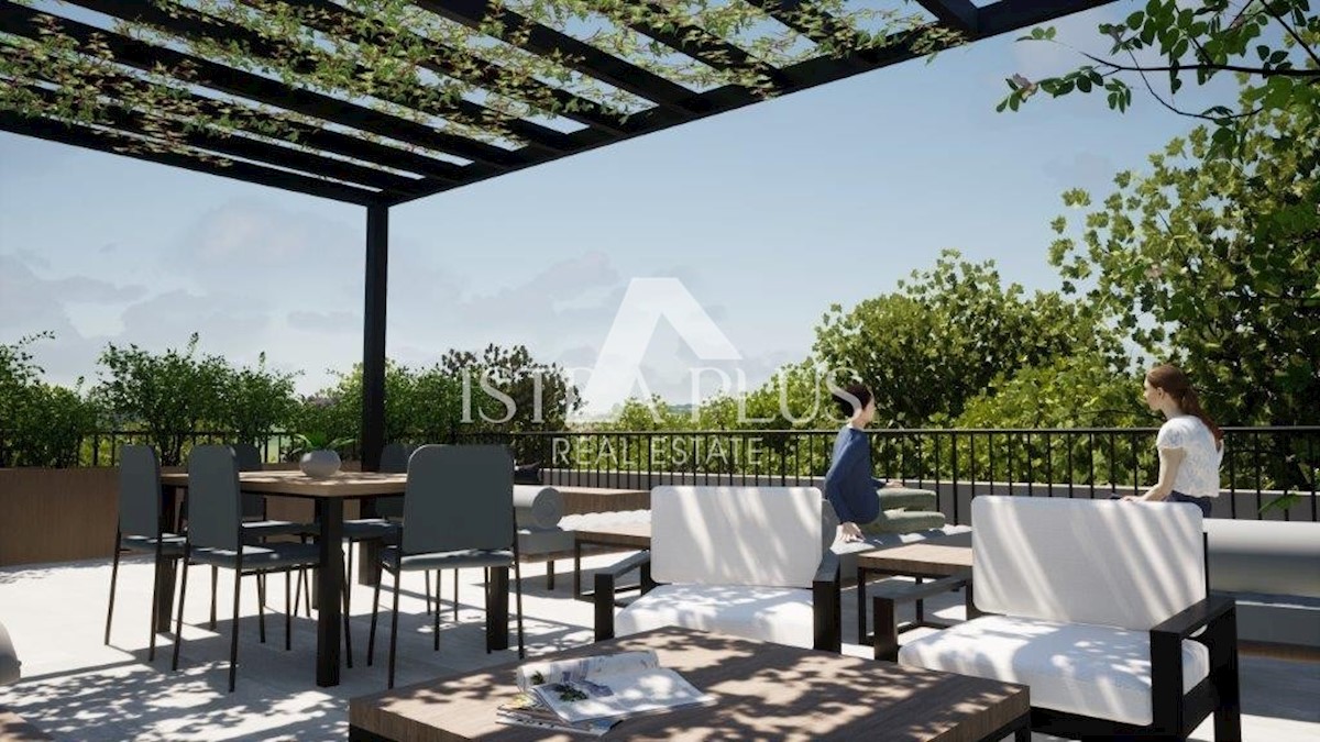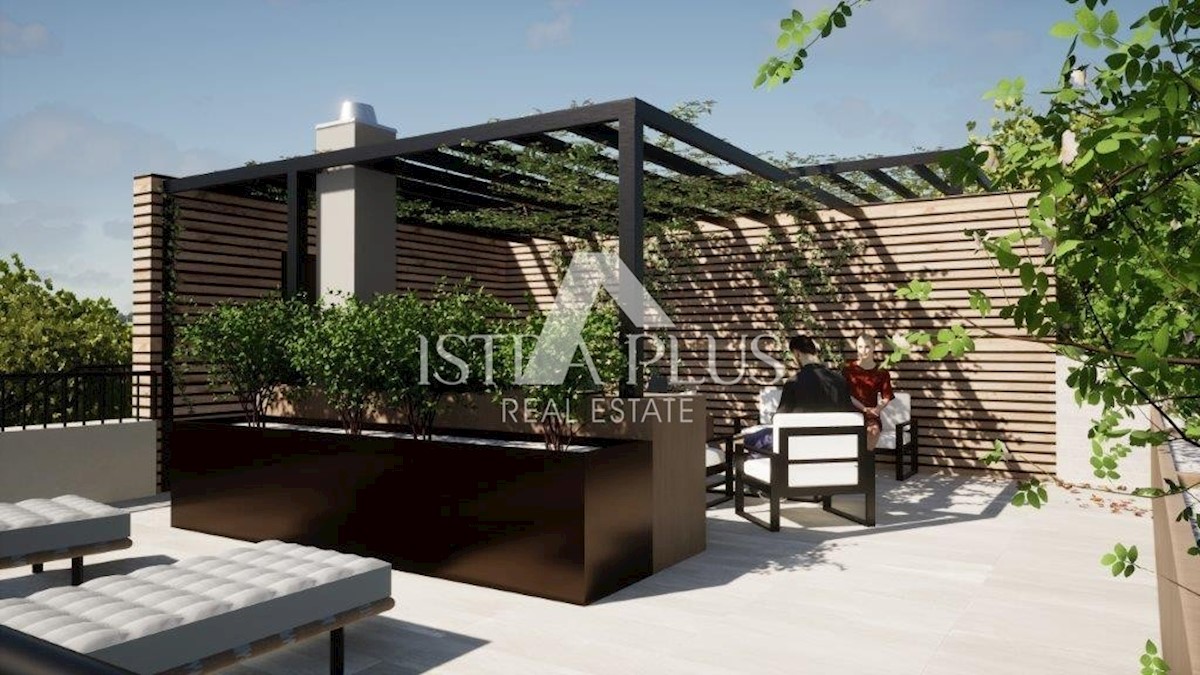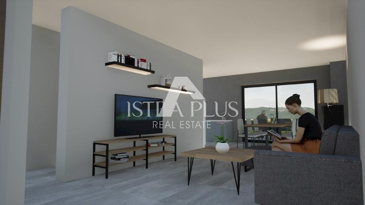 S05 Lep projekt v bližini Poreča, Vsako stanovanje ima ločen vhod in parkirno mesto Apartma 5 se nahaja v 1. nadstropju, komfortne površine 83,80 m2, obsega: hodnik, WC, kopalnico, dnevno sobo, kuhinjo in jedilnico, izhod na balkon, ter strešno teraso s
