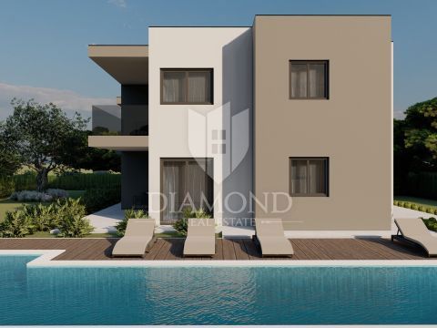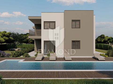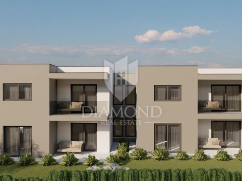 Poreč, okolica, dvosobno stanovanje v pritličju! Ta sodoben objekt s petimi stanovanjskimi enotami se nahaja v neposredni bližini železniške postaje Poreč. Objekt je od mesta in prvih plaž oddaljen le 4 km. Nahaja se na robu vasi in je obdana z modernim