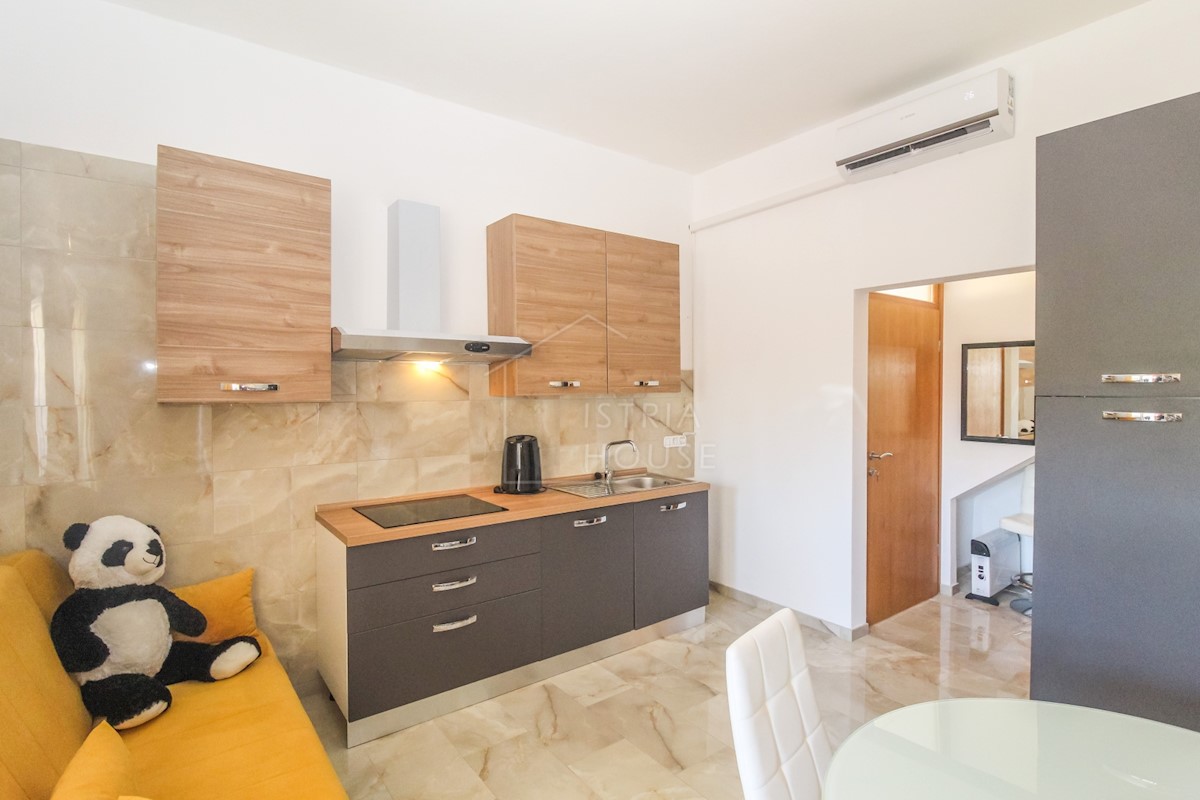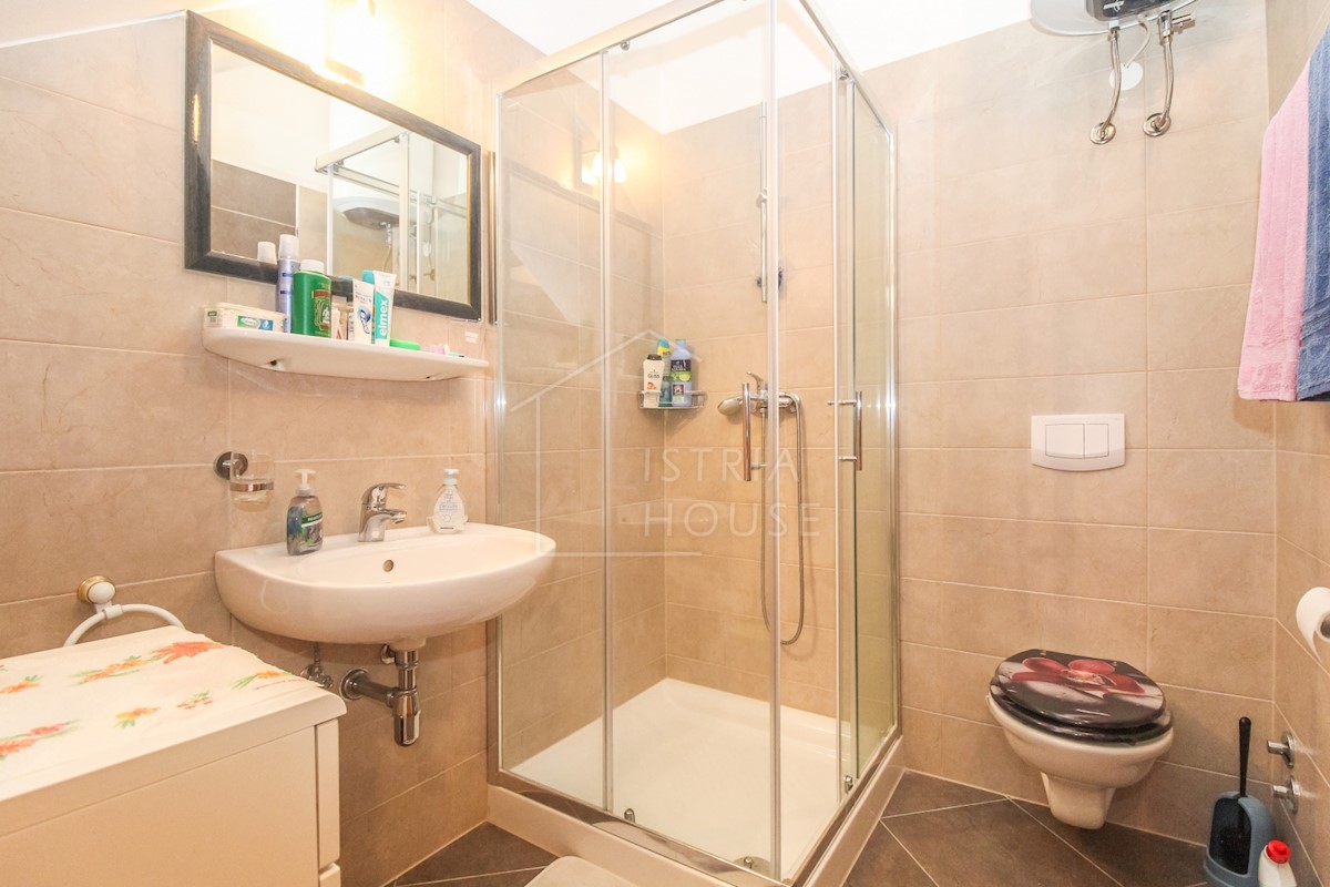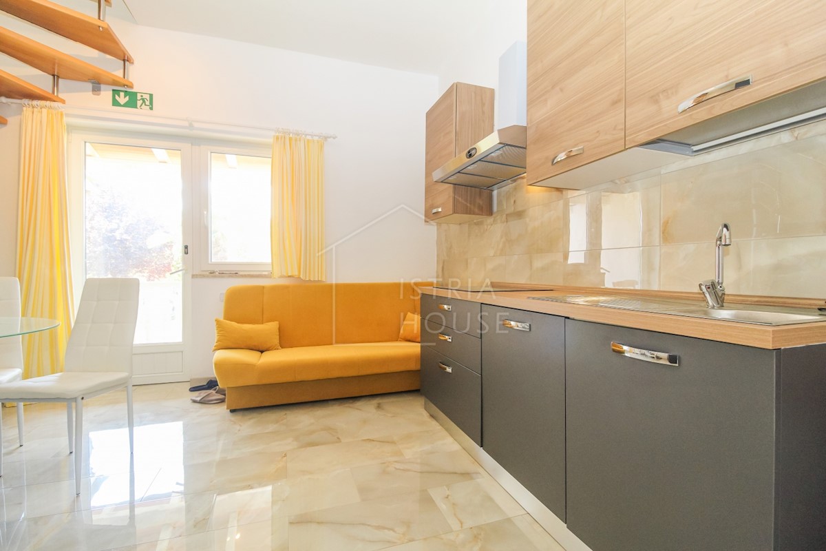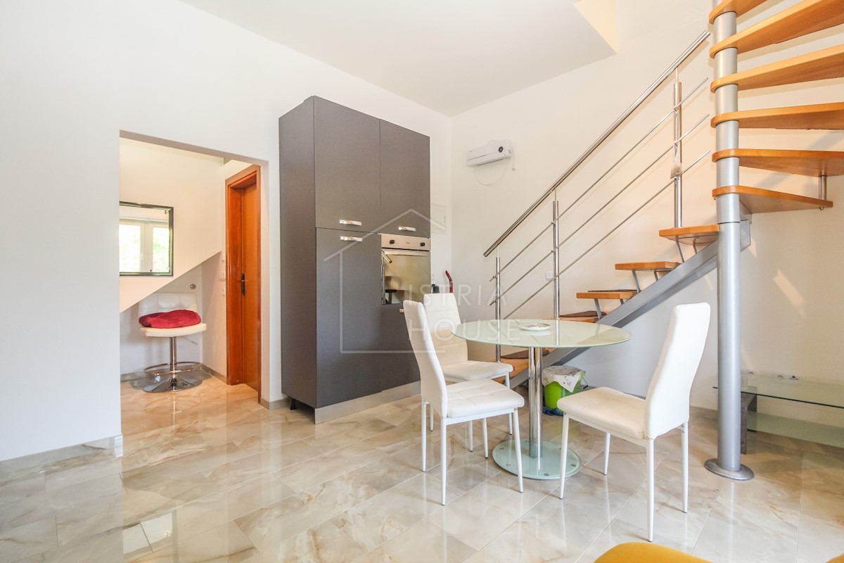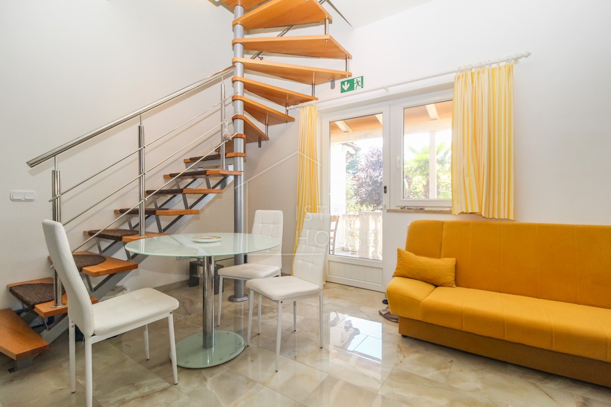 Istra, Poreč Na novo urejeno stanovanje v pritličju z lastnim vrtom v predmestju Poreča je naprodaj. Stanovanje se nahaja v stanovanjski stavbi v visokem pritličju v skupni izmeri 52 m2 in se razteza v dveh etažah. Pritličje obsega dnevno sobo s kuhinjo,