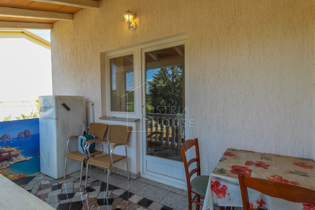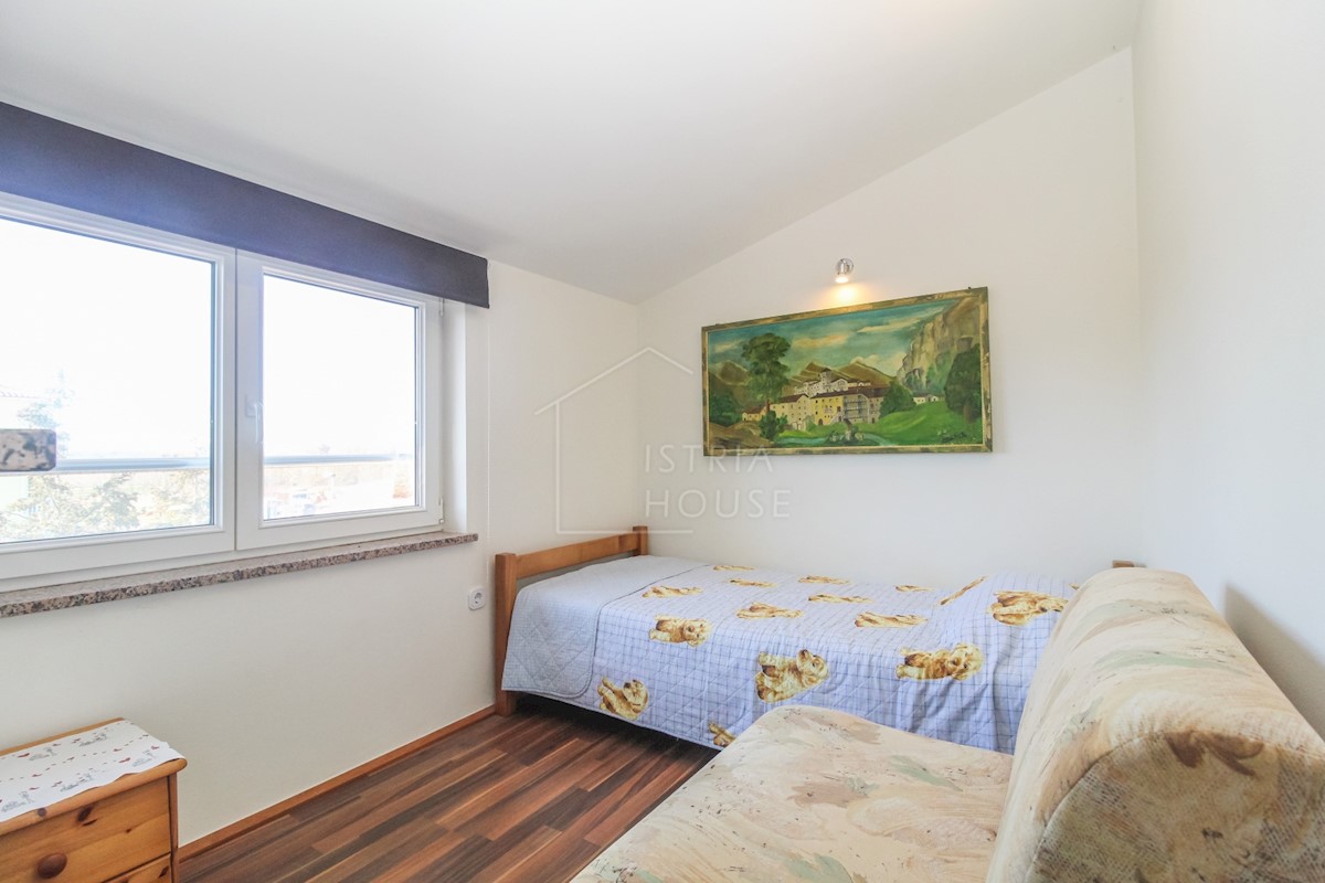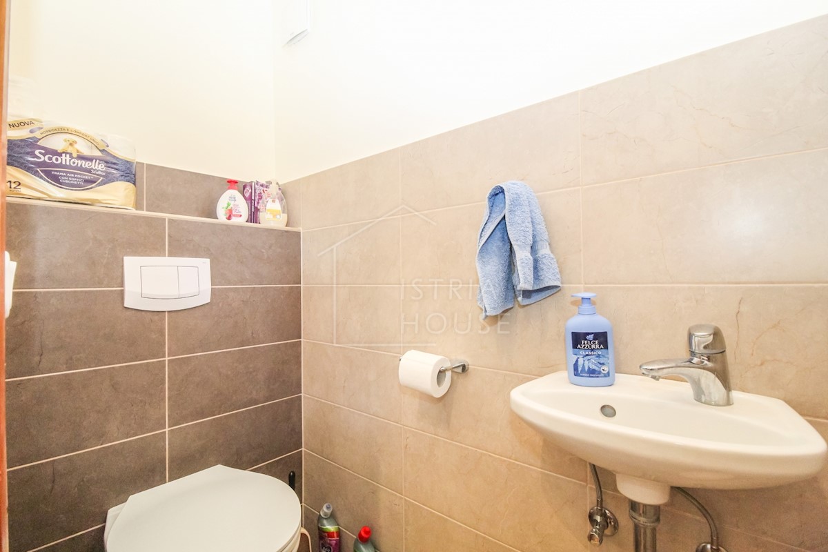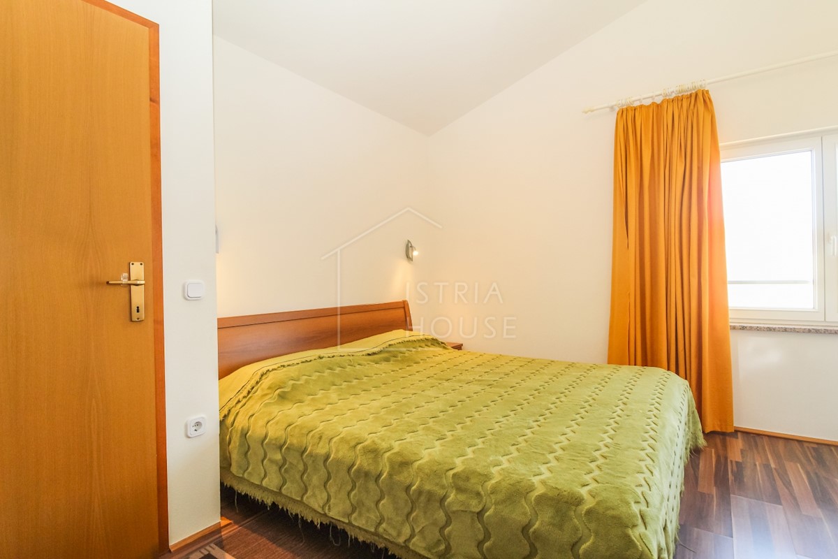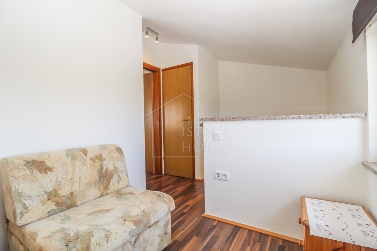 Istra, Poreč Na novo urejeno stanovanje v pritličju z lastnim vrtom v predmestju Poreča je naprodaj. Stanovanje se nahaja v stanovanjski stavbi v visokem pritličju v skupni izmeri 52 m2 in se razteza v dveh etažah. Pritličje obsega dnevno sobo s kuhinjo,