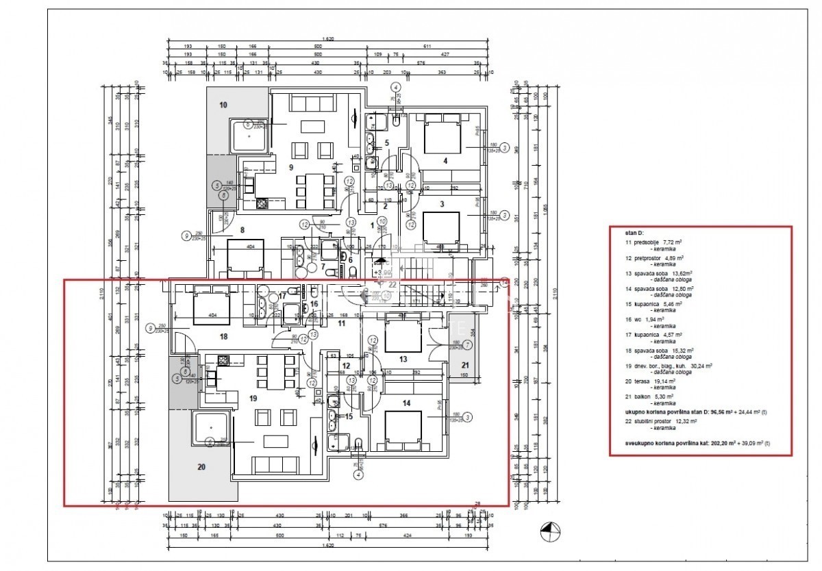 S64 - Stan D Luksuzno stanovanje v okolici Poreča. Stanovanje se nahaja v prvem nadstropju s skupno površino 96,56 m2 in je sestavljeno iz predsobe, glavne spalnice z lastno kopalnico, 2 spalnici (ena z lastnim balkonom), ki si delita eno kopalnico, dnevn
