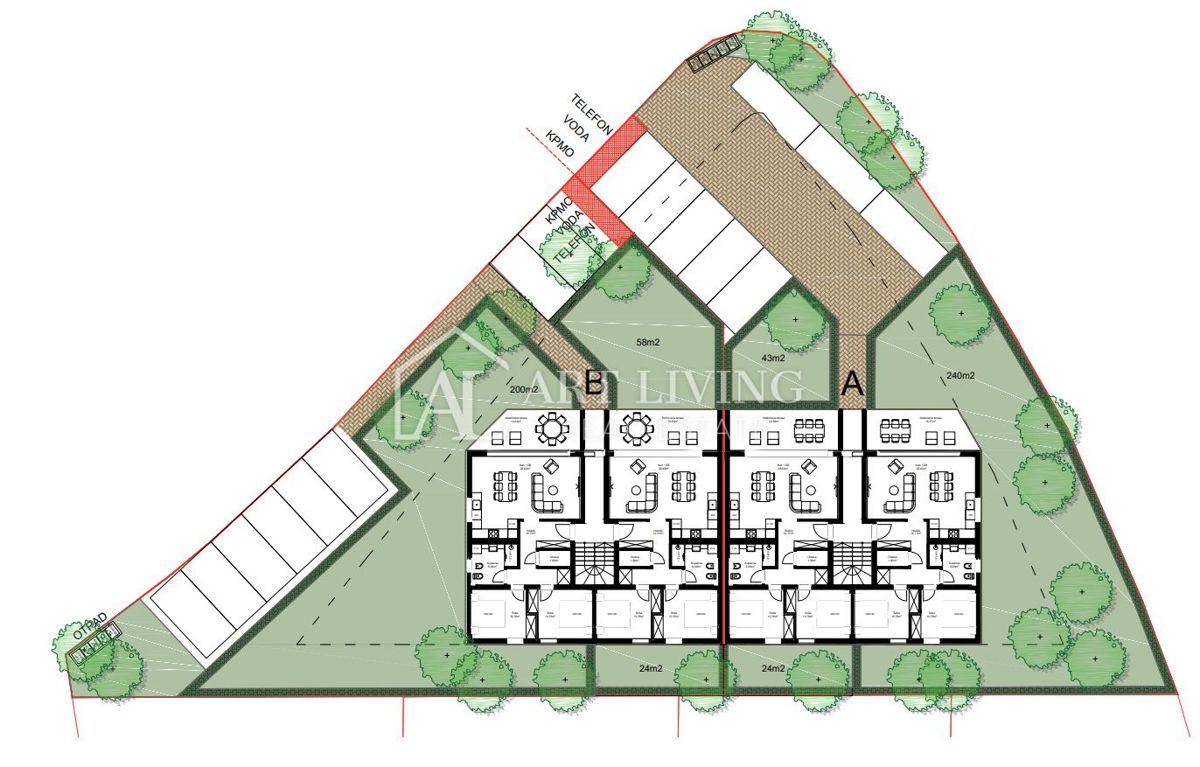 Istra, Poreč, okolica Stan B4 Na mirnoj lokaciji, na 8 km od Poreča te 2500 metara od mora i uređenih plaža prodaje se stan u maloj zgradi sa 4 stana. Stan na prvom katu ukupne neto površine 77,82 m2, sastoji se od dnevnog boravka sa kuhinjom i blagova