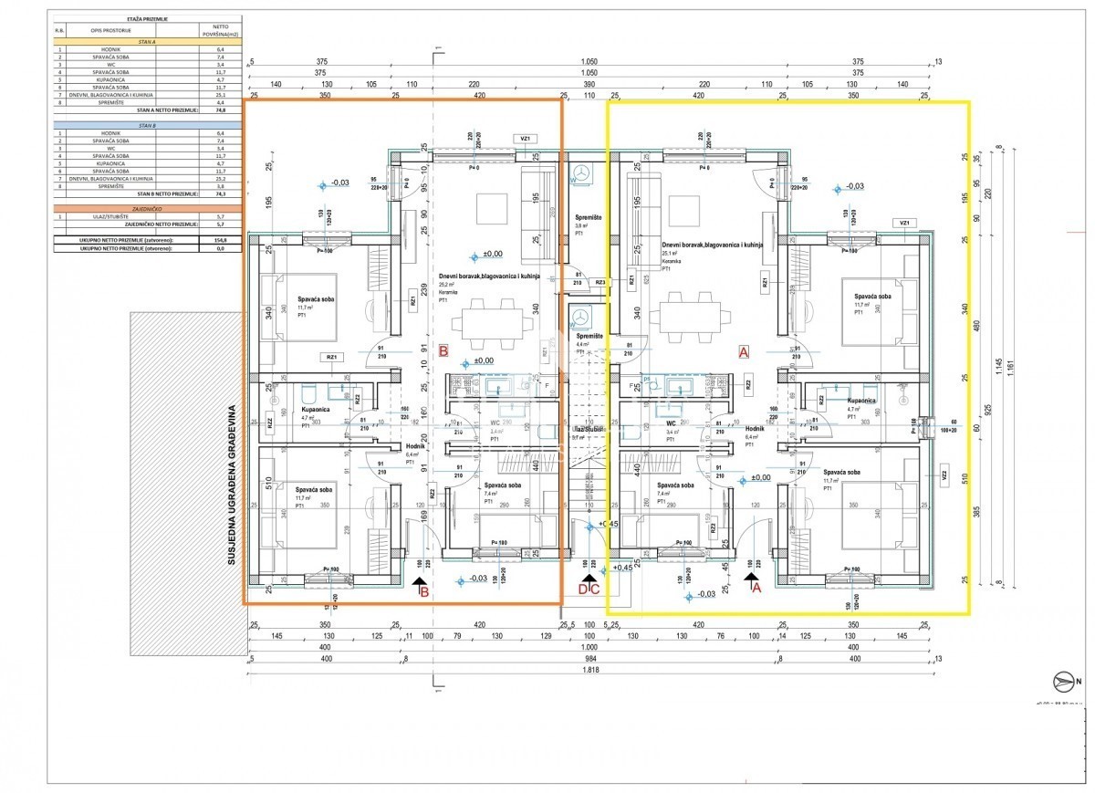 S133 ZGRADA A Stan B ukupno sa terasom neto 78.93m2 , prizemlje sa dvorištem 75.01m2 Stambena površina 74,3 m2 Vlastiti ulaz ; Sastoji se od hodnika , Wc , kuhinja, blagovaonica i dnevni boravak sa izlazom na terasu 18.50m2 sa pergolom te dvorište . Tr