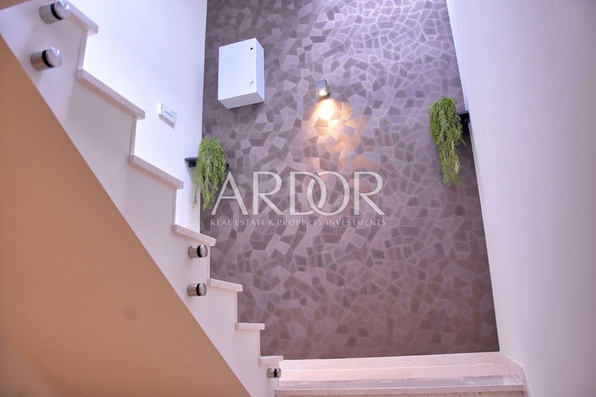 Posredujemo u prodaji modernog penthouse-a koji se nalazi se na samo 550 metara udaljenosti od mora i prve uređene plaže sa kamenim oblucima i borovom šumom. Pješke se može ići na plažu i u centar grada, te nije potrebno koristiti automobil. Penthouse se