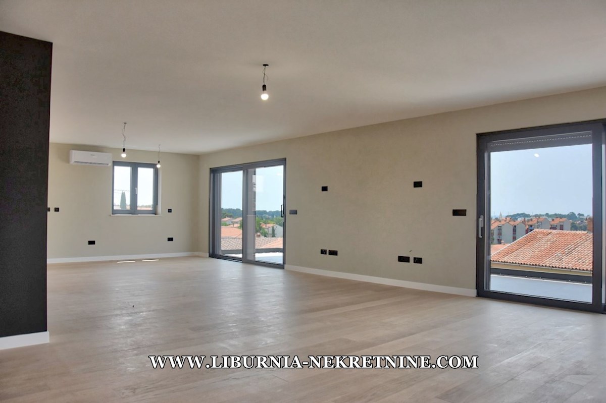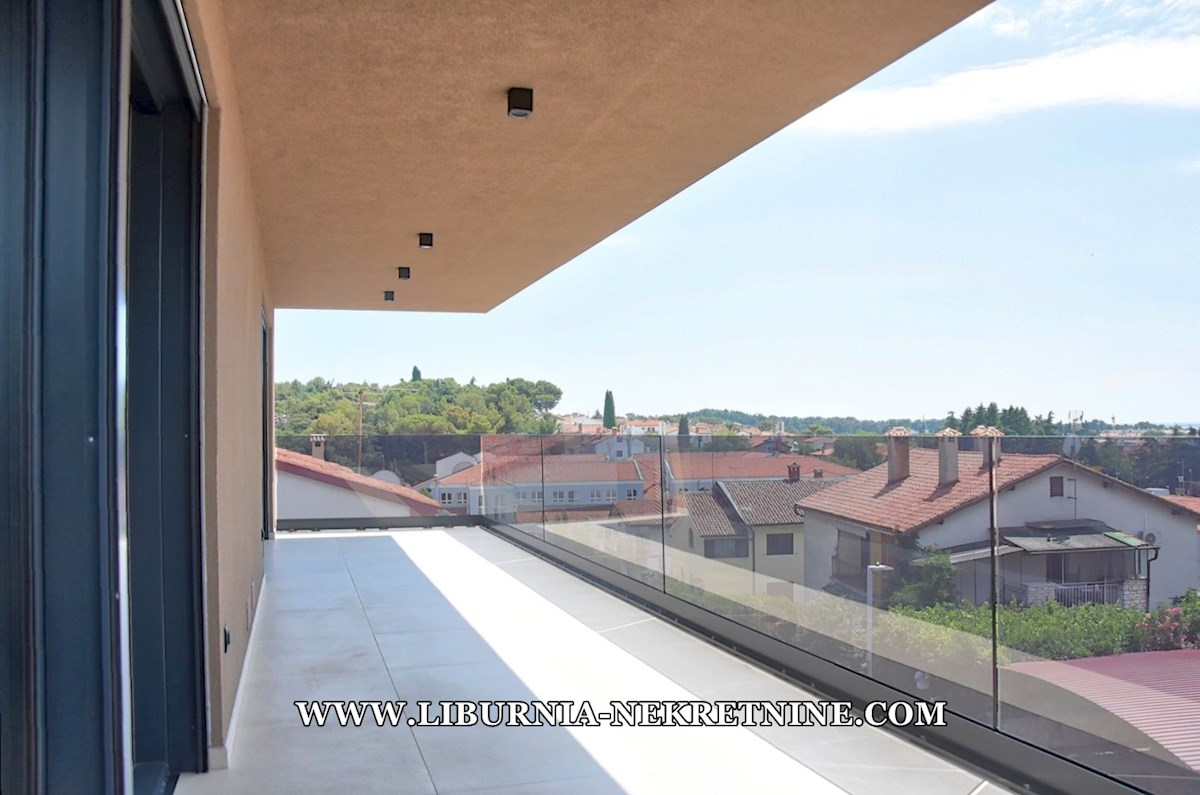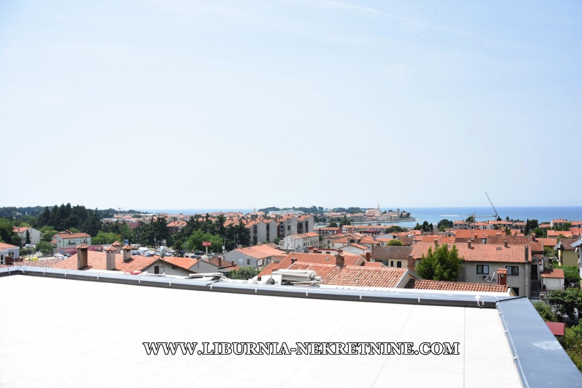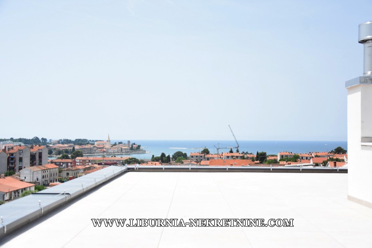 Istra, Poreč. Ekskluzivan penthouse sa krovnom terasom, garažom, dizalo, otvoren pogled na more, 500 metara od mora.