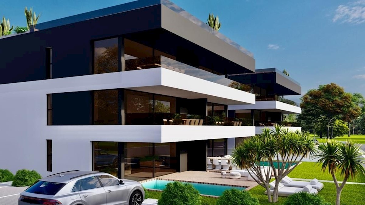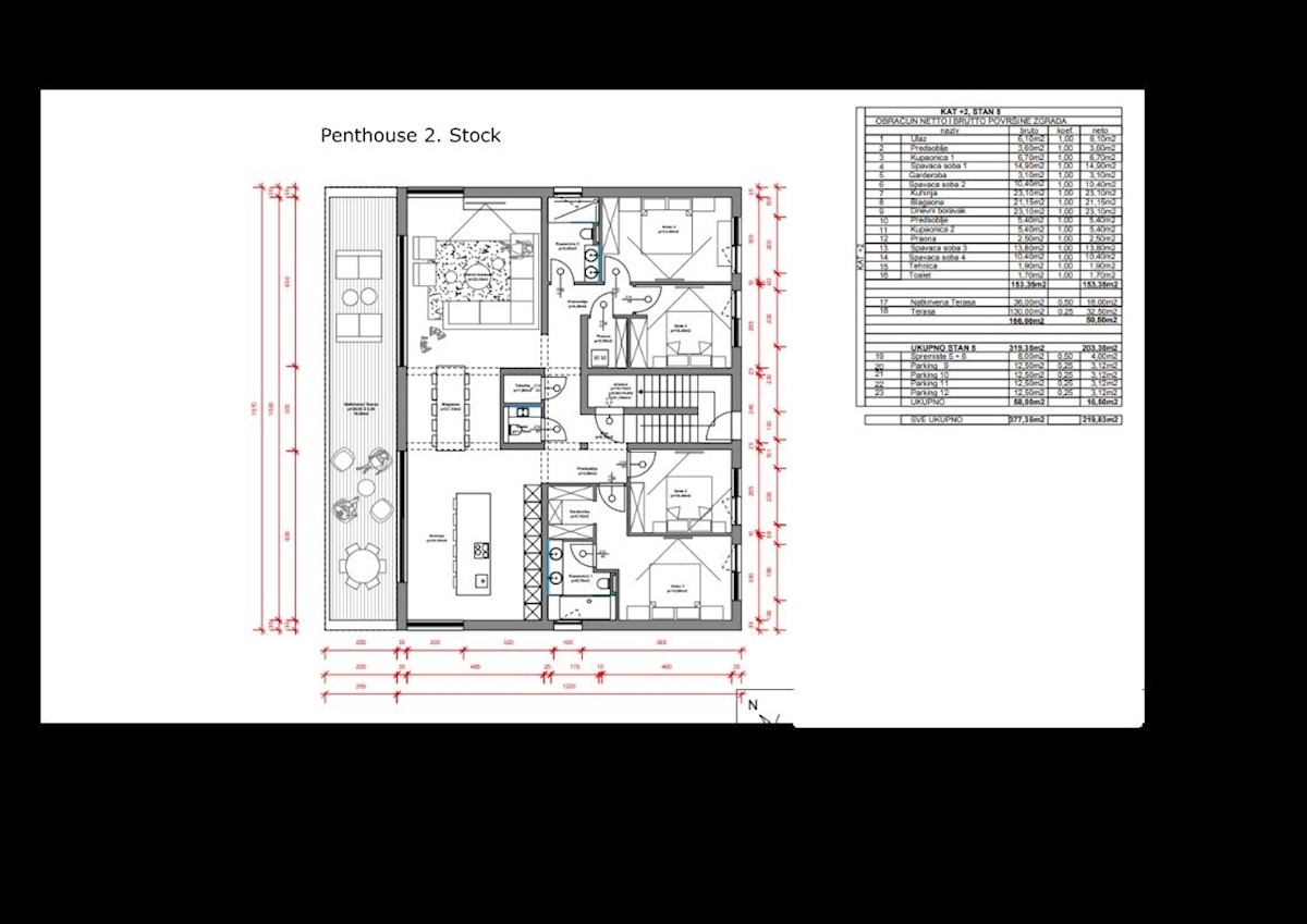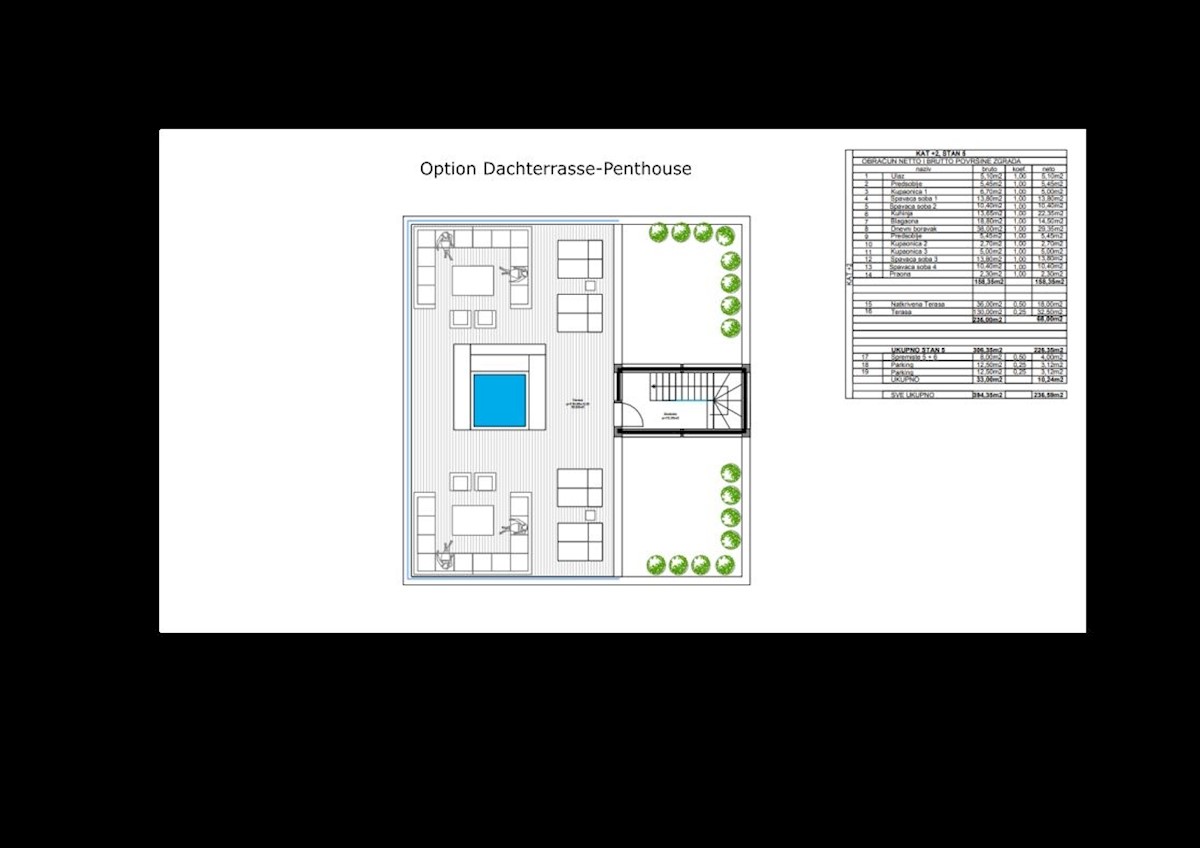 Prodaje se luksuzni penthouse u okolici Poreča u izgradnji. Sastoji se od prostranog dnevnog boravka, kuhinje i blagovaonice, od 67,36 m2, velike terase površine 36 m2, četiri spavaće sobe , praonice tehničke sobe , WC-a i dvije kupaonice.Penthouse dolazi