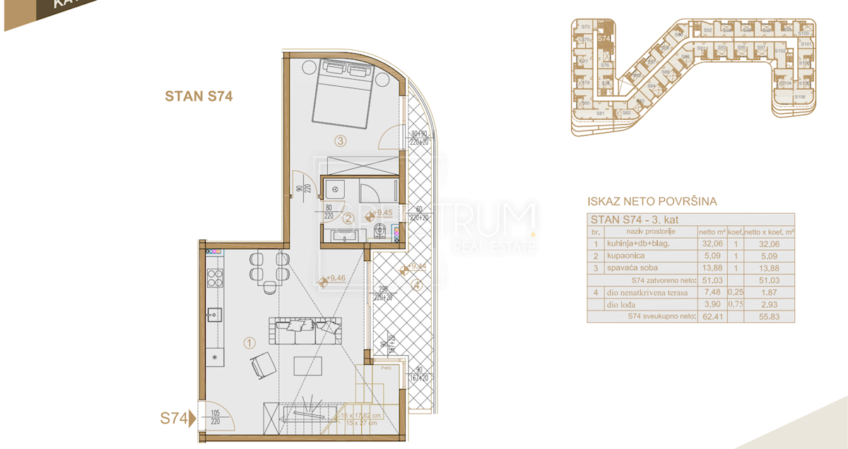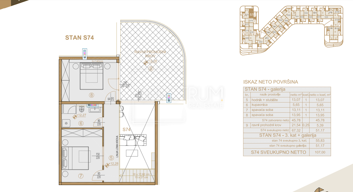 Istra, Poreč Prodaje se moderan dvoetažan stan sa pogledom na more u Poreču. Stan se proteže kroz 3.kat i galeriju novoizgrađenog stambeno - poslovnog kompleksa koji se sastoji od 2 podzemne i 3 nadzemne etaže sa galerijama. Površina stana iznosi 107 m2
