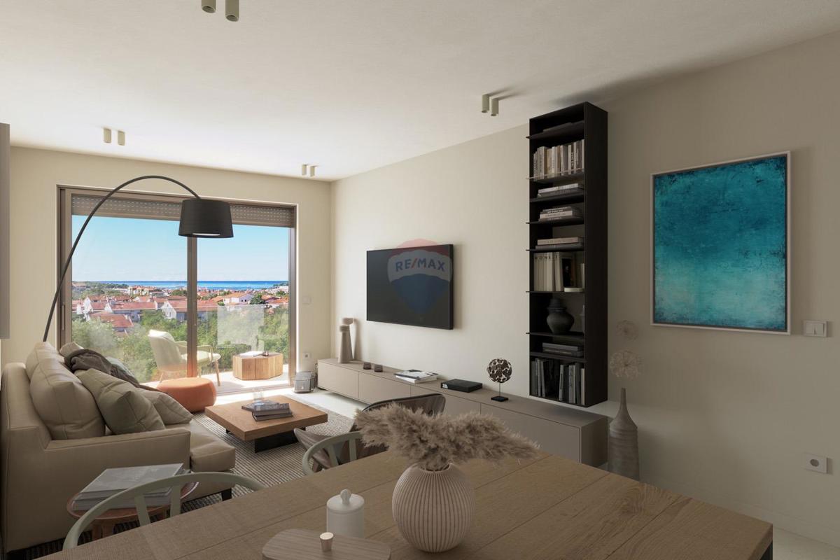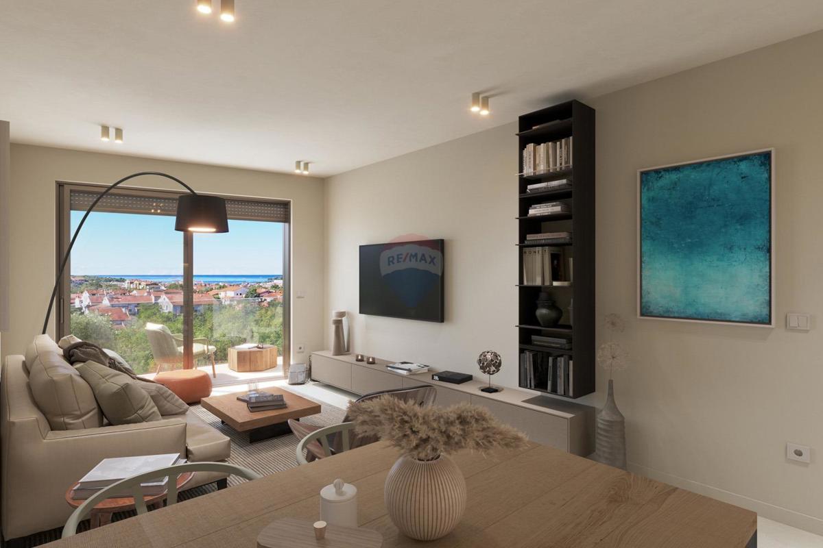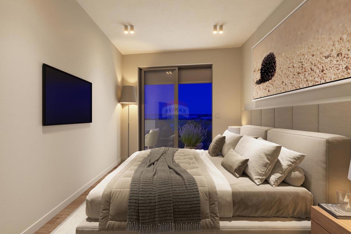 Visokokvalitetan stan smješten na trećem katu u novogradnji opremljenoj liftom. Stambena površina stana iznosi 138,44 m2 te se sastoji od ulaznog hodnika otvorenog prostora dnevnog boravka s izlazom na terasu s prekrasnim pogledom na more, kuhinje s blago