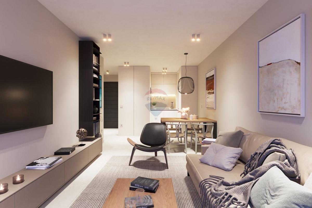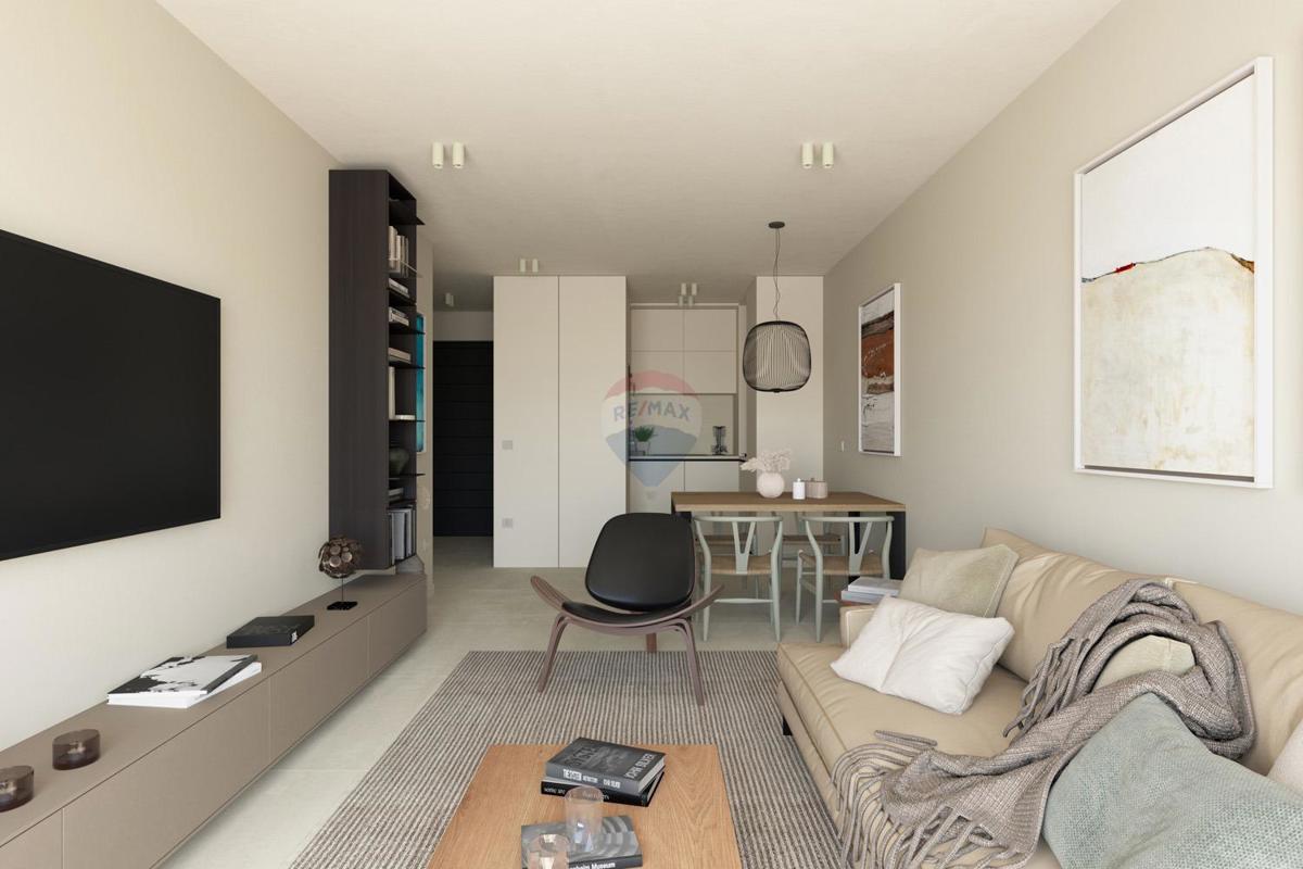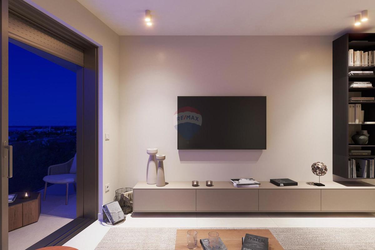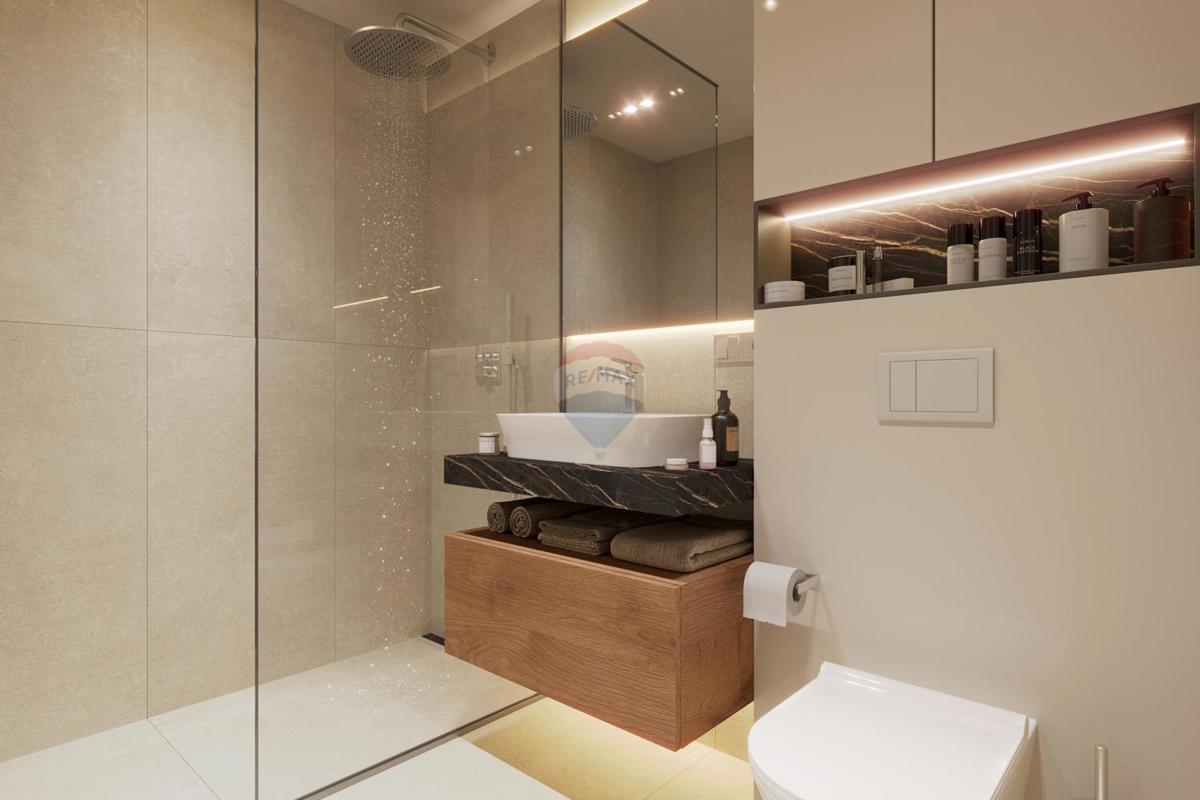 Visokokvalitetan stan smješten na trećem katu u novogradnji opremljenoj liftom. Stambena površina stana iznosi 138,44 m2 te se sastoji od ulaznog hodnika otvorenog prostora dnevnog boravka s izlazom na terasu s prekrasnim pogledom na more, kuhinje s blago