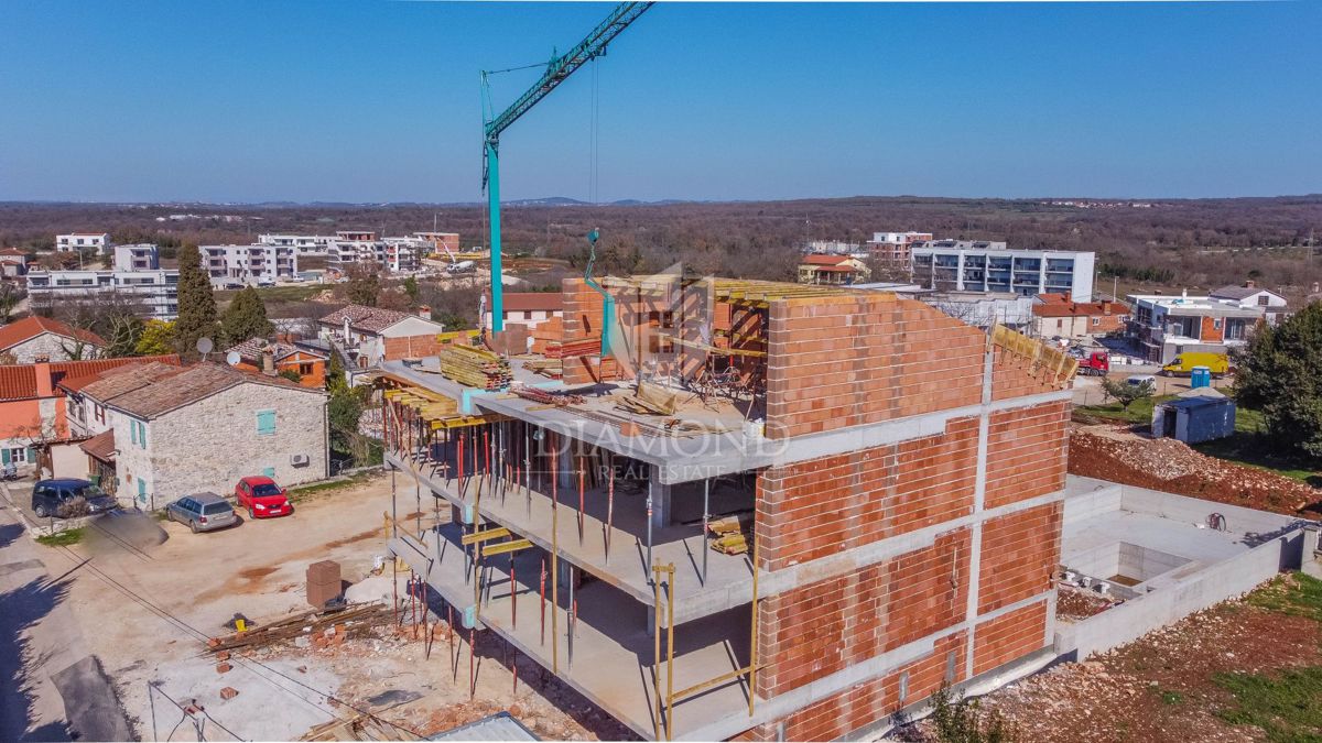 Poreč, okolica, luksuzan stan na prvom katu s krovnom terasom i pogledom na more! U mirnom mjestu na svega 2 kilometra od mora, na plodnoj visoravni od 112 m nadmorske visine sa pogledom na Alpe prodaje se fantastičan stan na prvom katu s prostranim bal