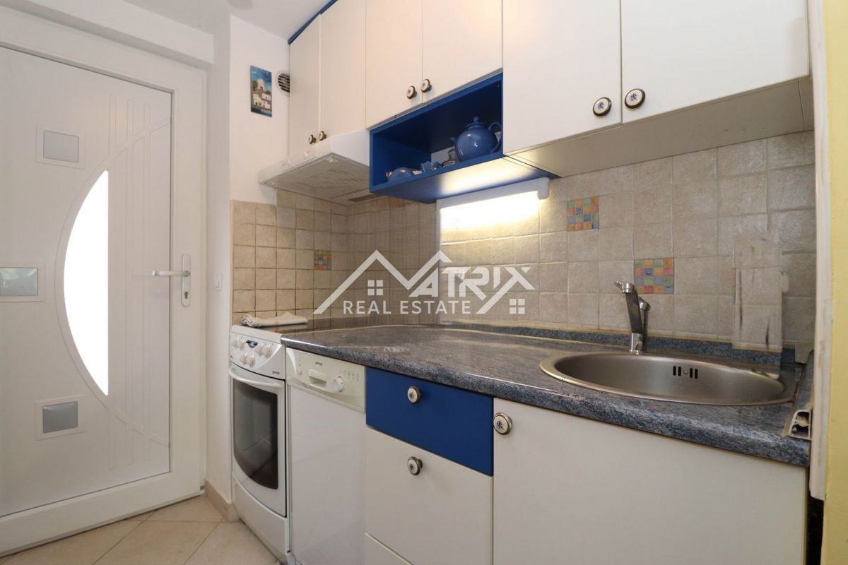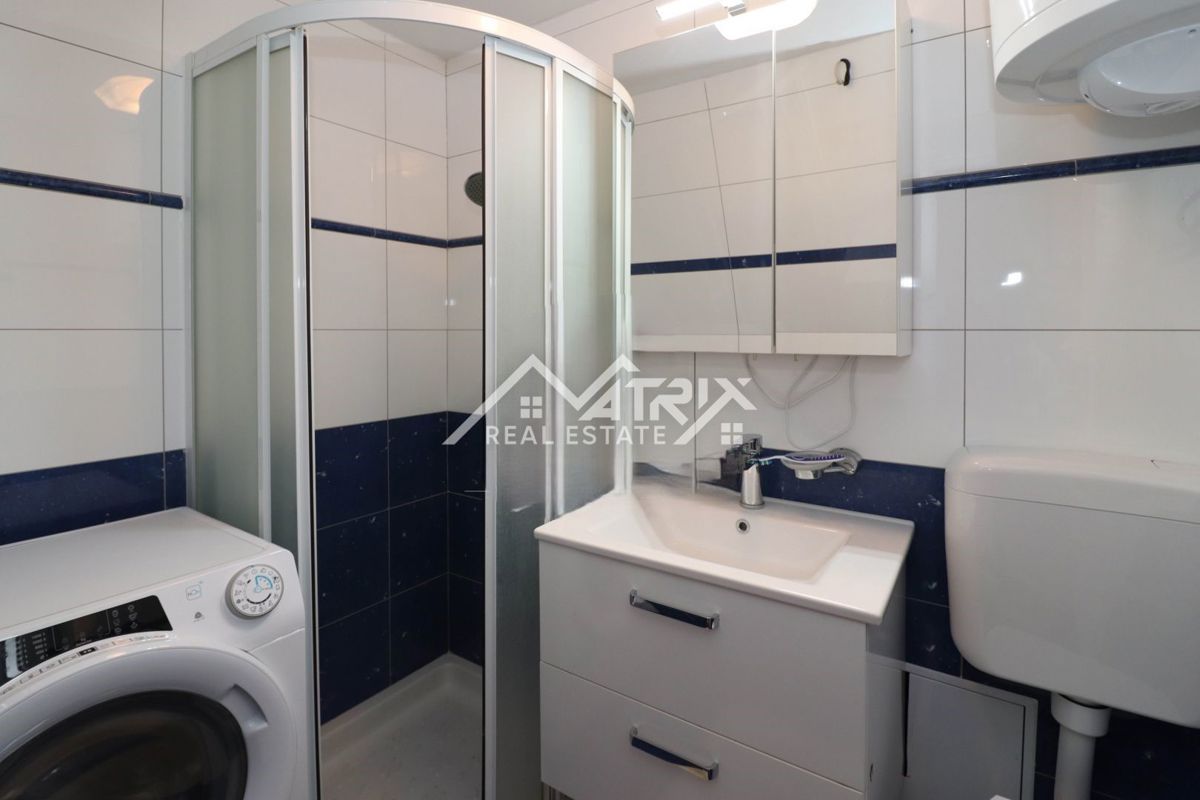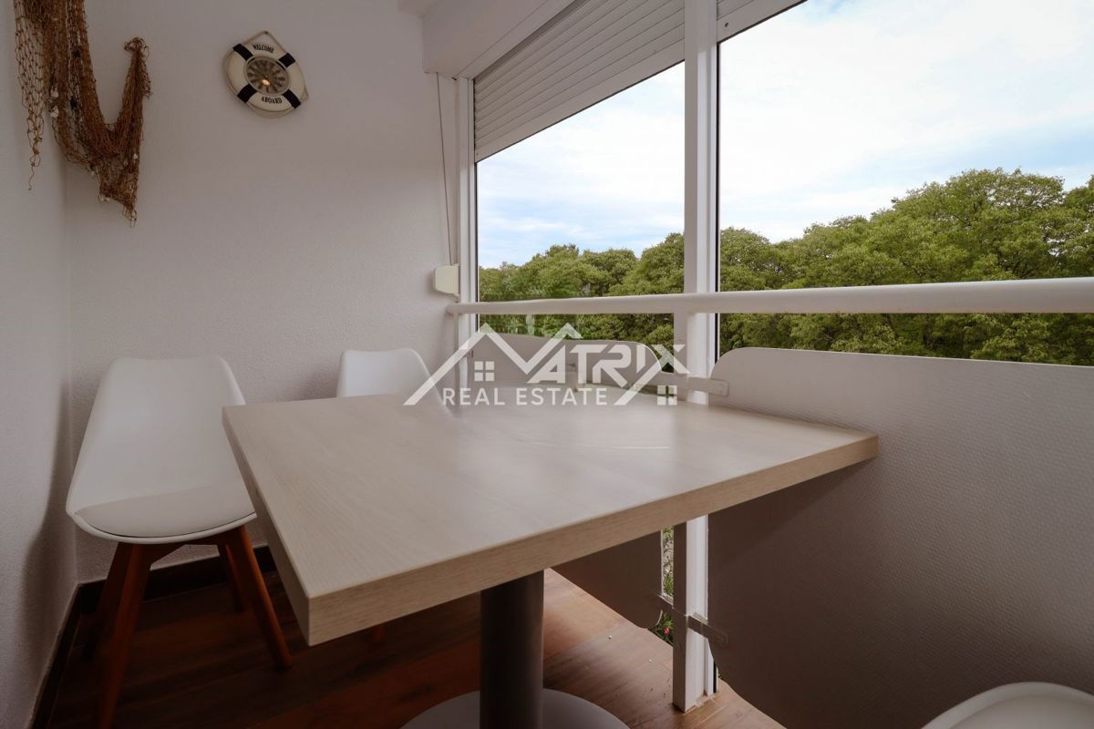 Poreč okolica jednosoban stan s terasom, 150 m od mora Prodaje se funkcionalan jednosoban stan na odličnoj lokaciji u Poreču, udaljen samo 150 metara od mora i plaža. Stan je potpuno namješten i prostire se na 38,14 m², pružajući sve što je potrebno za u