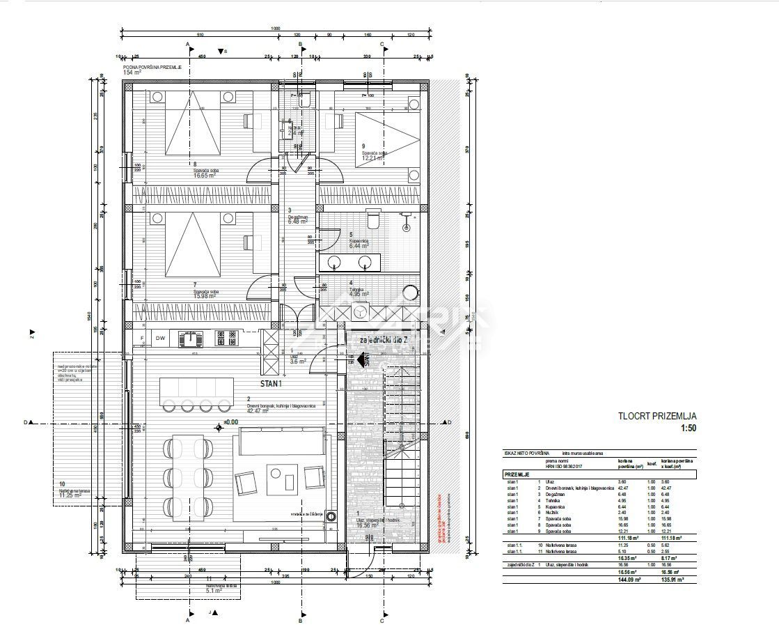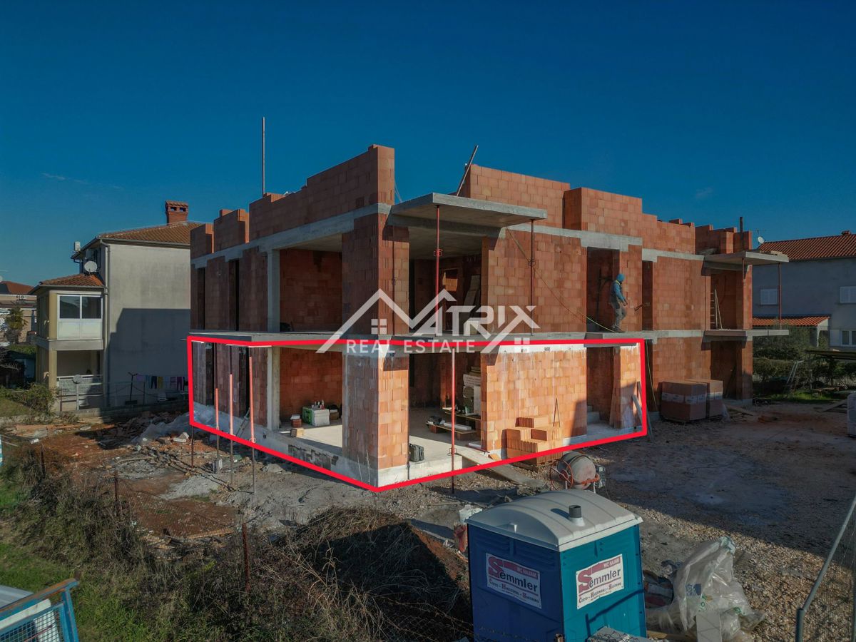 Na prodaju je stan u stambenoj zgradi koja je trenutno u fazi gradnje, s planiranim završetkom krajem 2025. godine. Stan se nalazi u prizemlju i sastoji se od prostranog dnevnog boravka, kuhinje i blagovaonice u modernom open-space konceptu, tri udobne sp