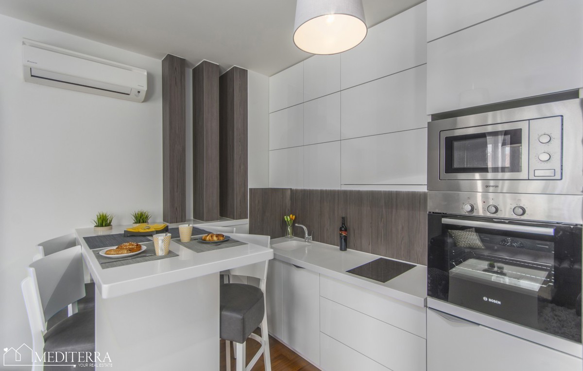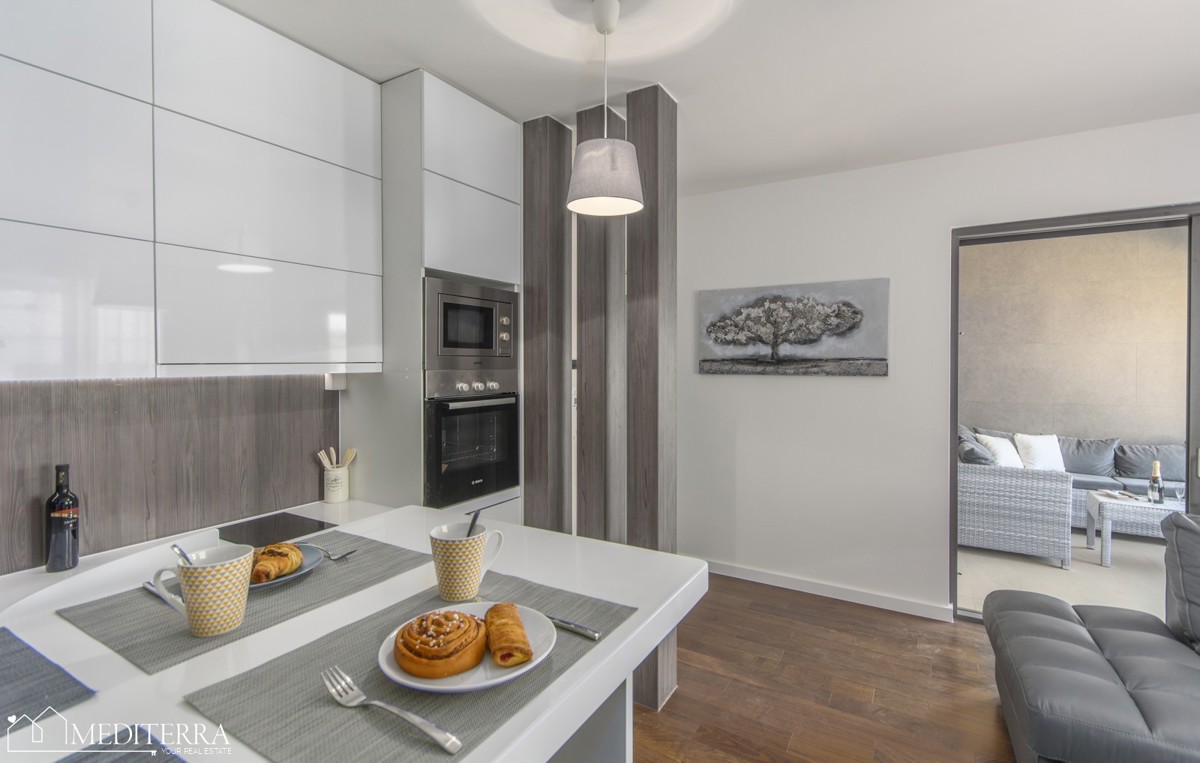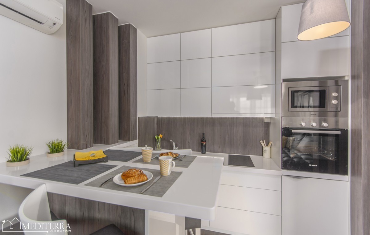 Prodaje se stan na jedinstvenoj lokaciji na samo par minuta hoda od uređene plaže. Nalazi se na drugom katu moderne zgrade i sastoji se od spavaće sobe, kupaonice i velikog dnevnog boravka s izlazom na terasu. Stanu također pripada spremište od 3,18 m2 i