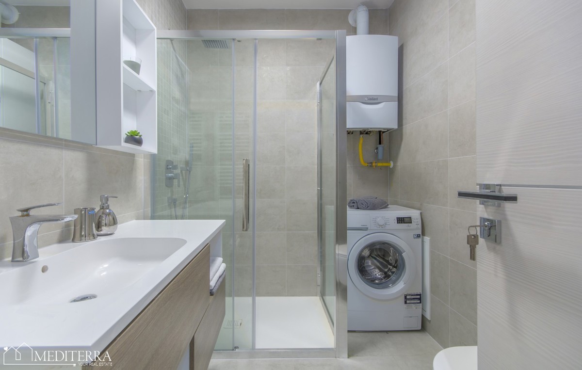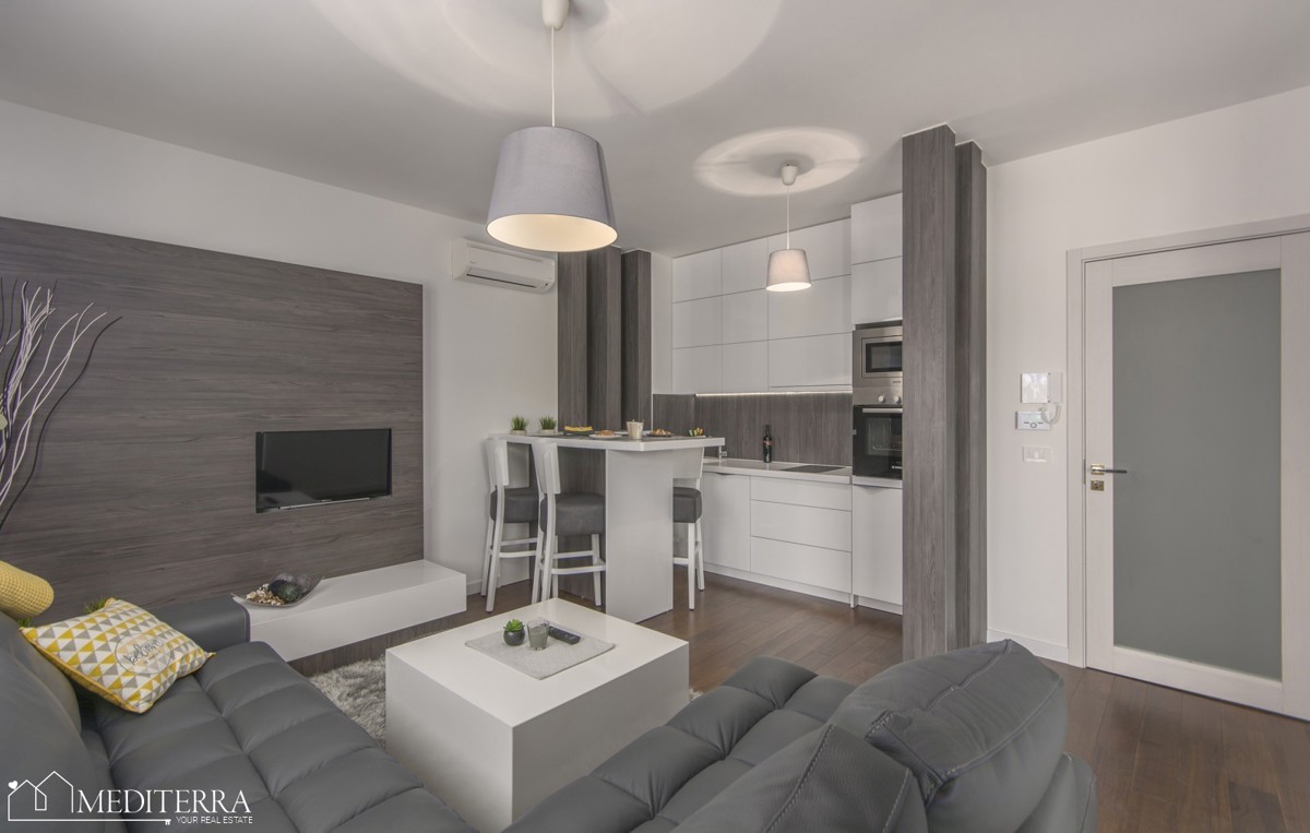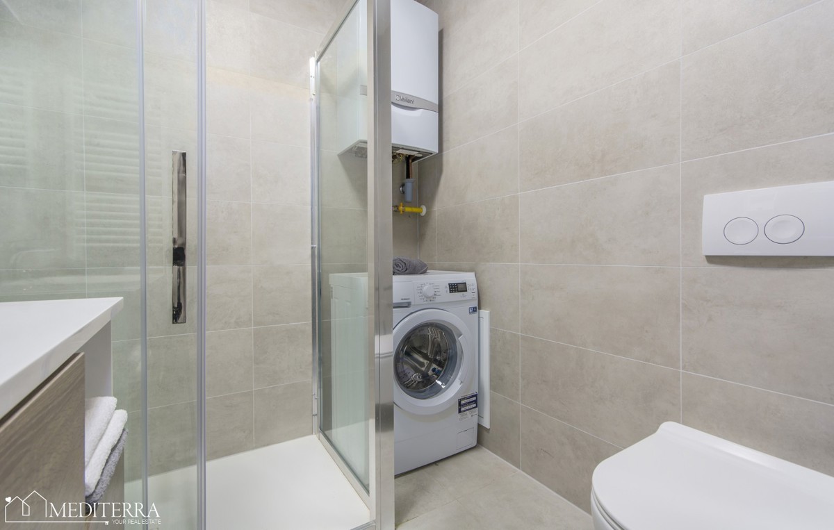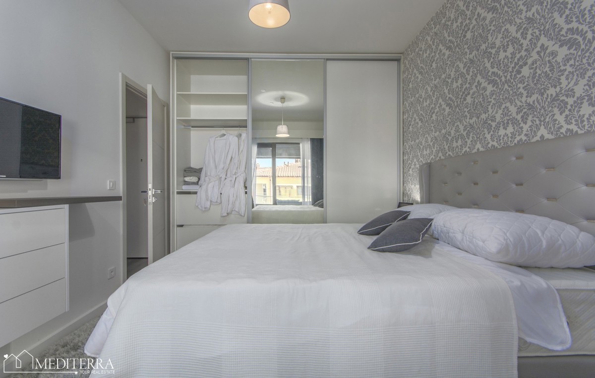 Prodaje se stan na jedinstvenoj lokaciji na samo par minuta hoda od uređene plaže. Nalazi se na drugom katu moderne zgrade i sastoji se od spavaće sobe, kupaonice i velikog dnevnog boravka s izlazom na terasu. Stanu također pripada spremište od 3,18 m2 i