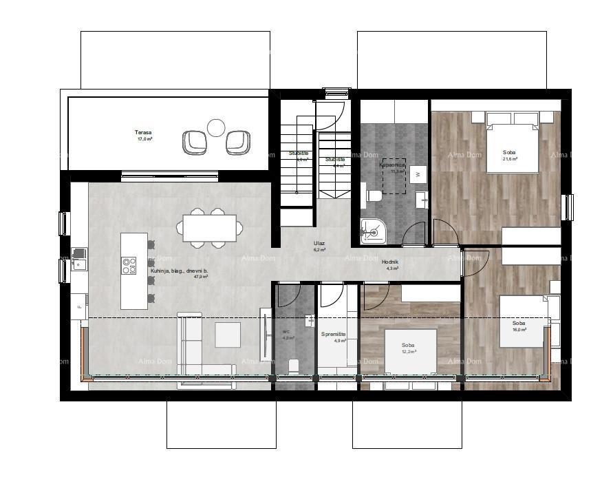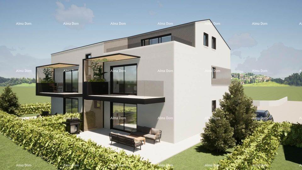 Prodaje se stan u novogradnji u Poreču. U izgradnji su 2 zgrade po 5 stanova. Stan površine 143.35 m2 nalazi se u potkrovlju zgrade. Stan se sastoji od ulaznog hodnika, hodnika, dnevnog boravka+kuhinja+blagovaona, 3 spavaće sobe, kupaonice, WC, spremišt
