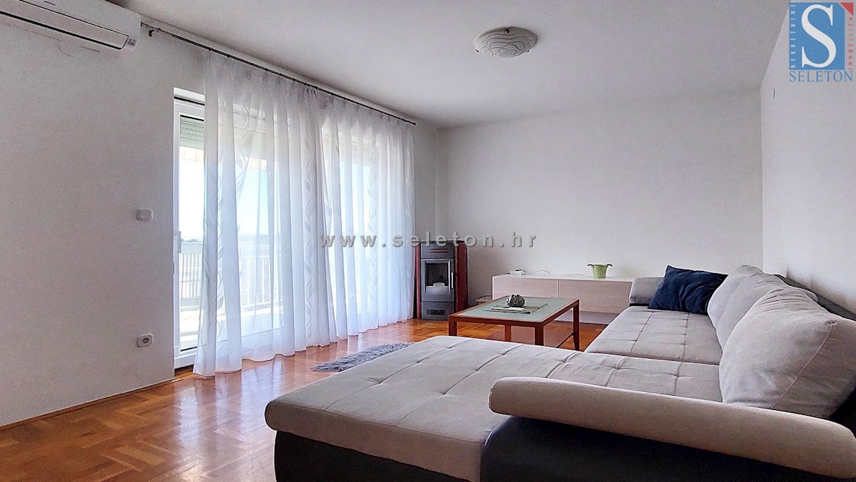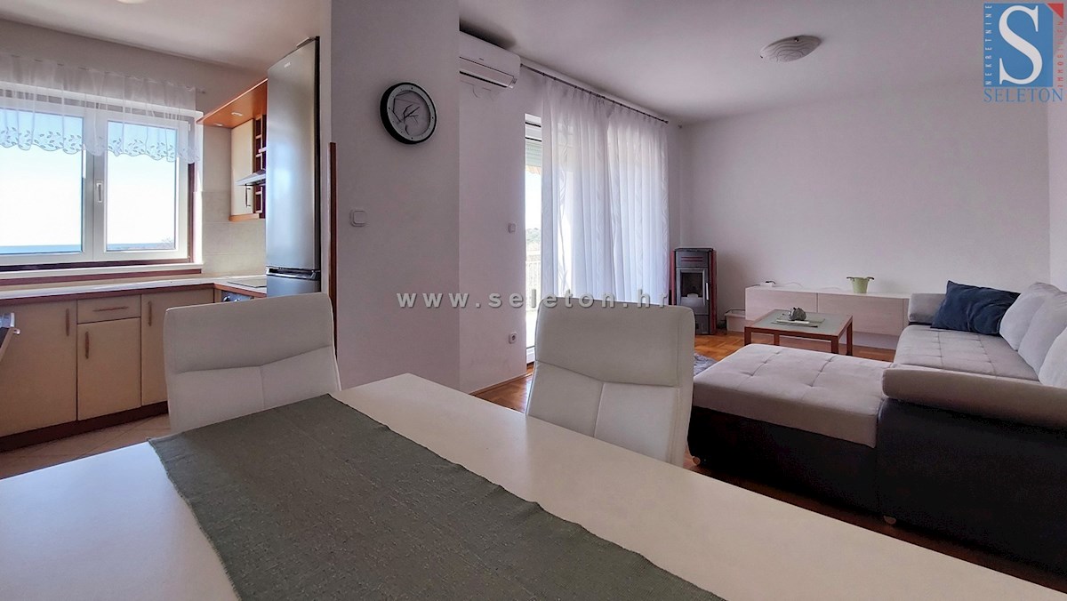 Prodaje se stan na prvom katu zgrade, stan ima površinu od 56 m², sastoji se od dnevnog boravka, blagovaonice, kuhinje, natkrivene terase, hodnika, dvije spavaće sobe i kupaonice. Stan se prodaje kompletno namješten, ima pogled na more, klima uređaj, tend