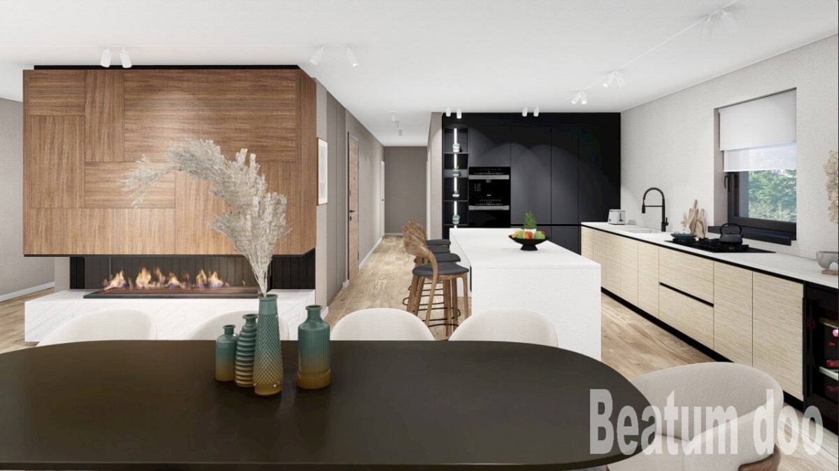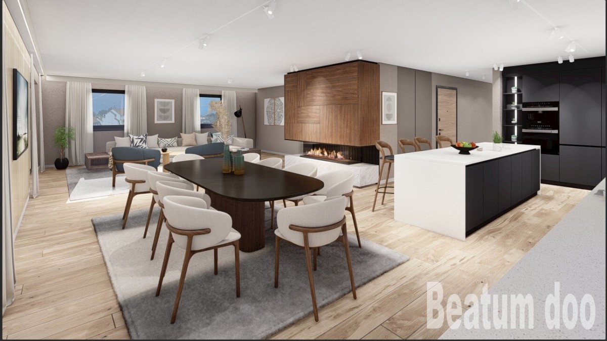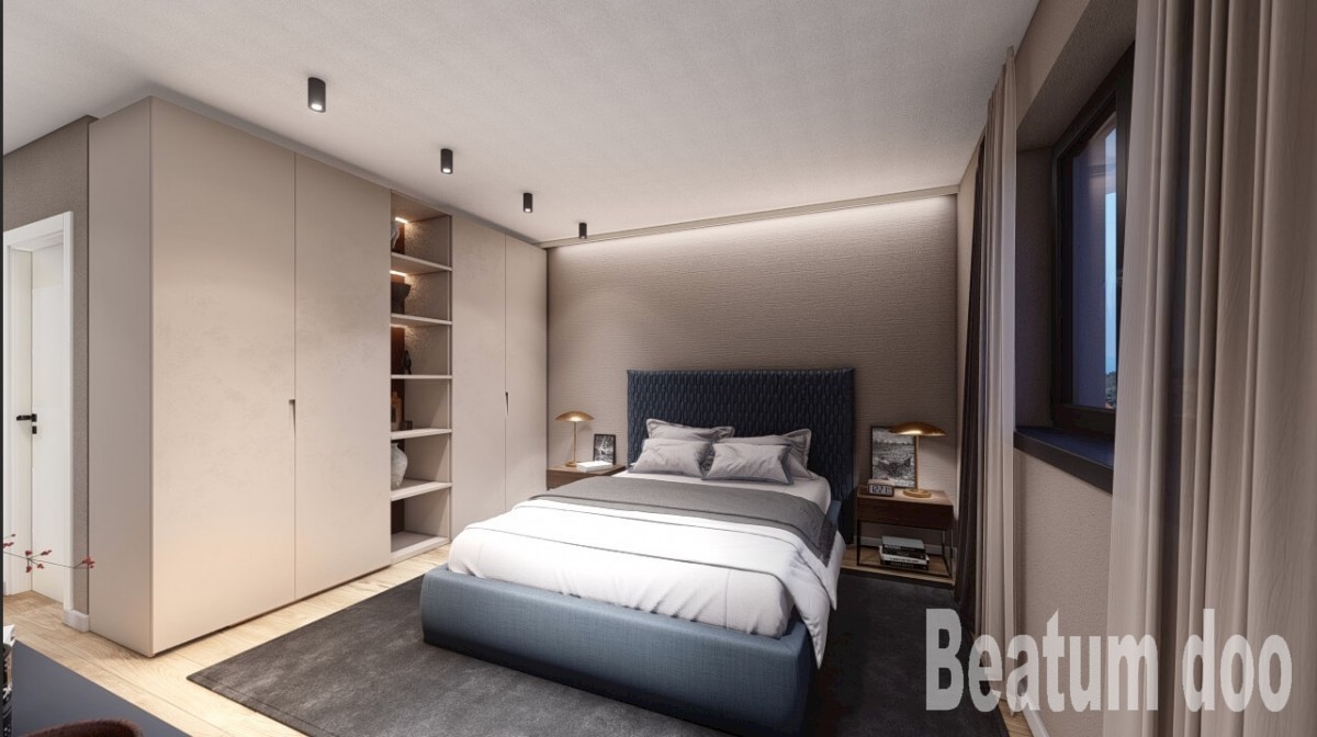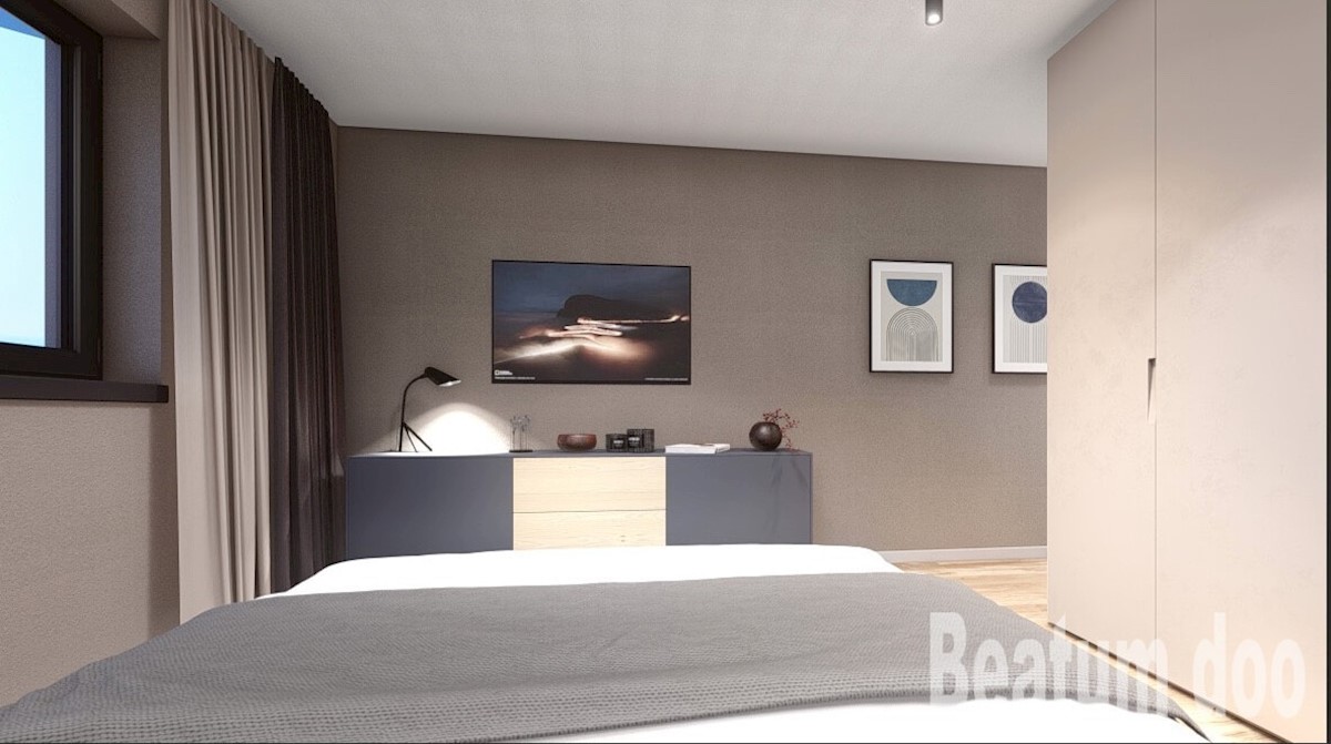Penthouse u centru Poreča s predivnim pogledom na more. Stan se sastoji od velikog dnevnog boravka sa kaminom na drva,kuhinja,blagovaona,ostava,5 spavaćih soba,5 kupatila i velika terasa . Stanu pripada jedna garaža i podrum. U zgradi je predviđen lift. O