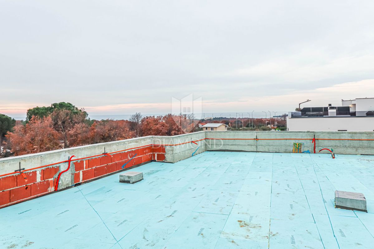Istra, Poreč, izvrstan stan sa pogledom na more! Na traženoj lokaciji u blizini centra grada Poreča prodaje se ovaj izvrstan stan na prvom katu sa krovnom terasom i panoramskim pogledom na more! Stan se nalazi na prvom katu zgrade sa četiri stambene jed