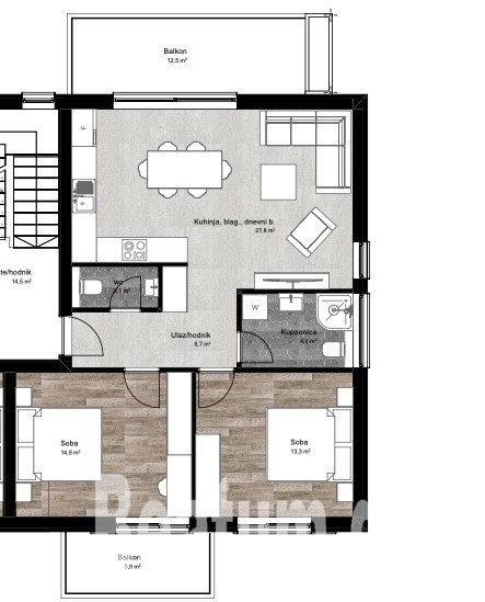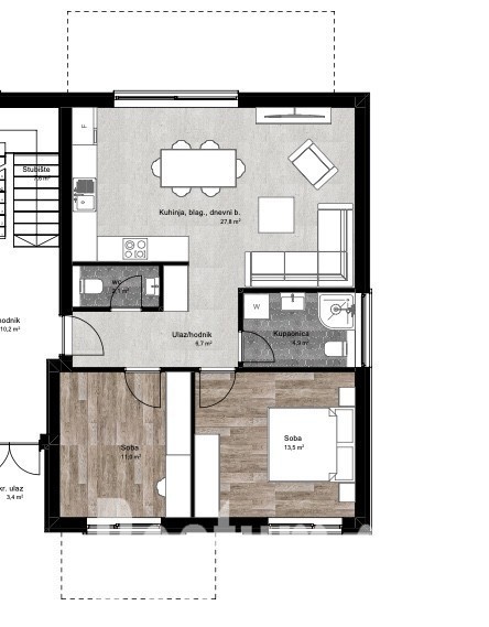 Wohnung im ersten Stock, im Bauwesen Zwei Schlafzimmer, Küche, Wohnzimmer, ein Badezimmer Parken