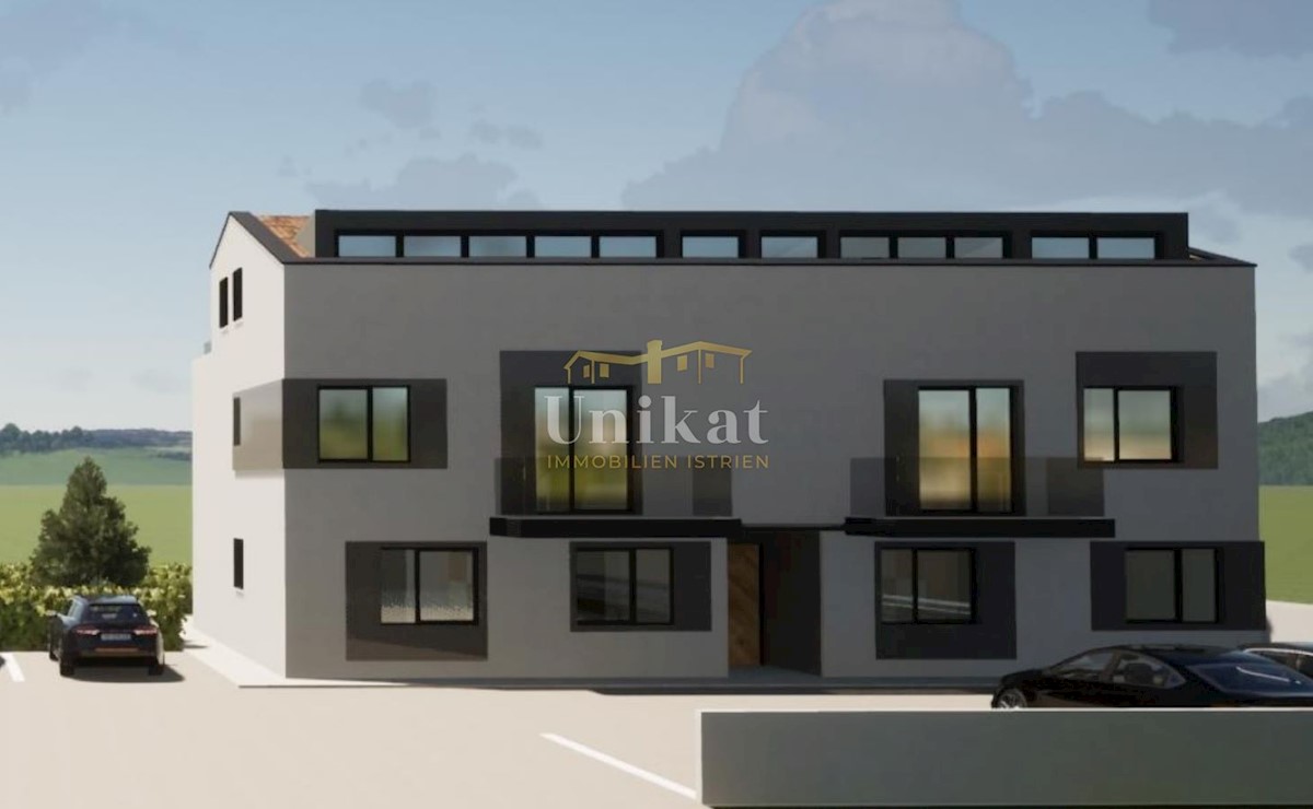 Neubau - Wohnungen 3 km von der Stadt Poreč und dem Meer entfernt. Diese Wohnung wird sich im ersten Stock befinden und aus Eingangsbereich, Wohnzimmer mit Küche und Essbereich, einer Toilette, zwei Schlafzimmern und einem Badezimmer bestehen. Die Wohnung
