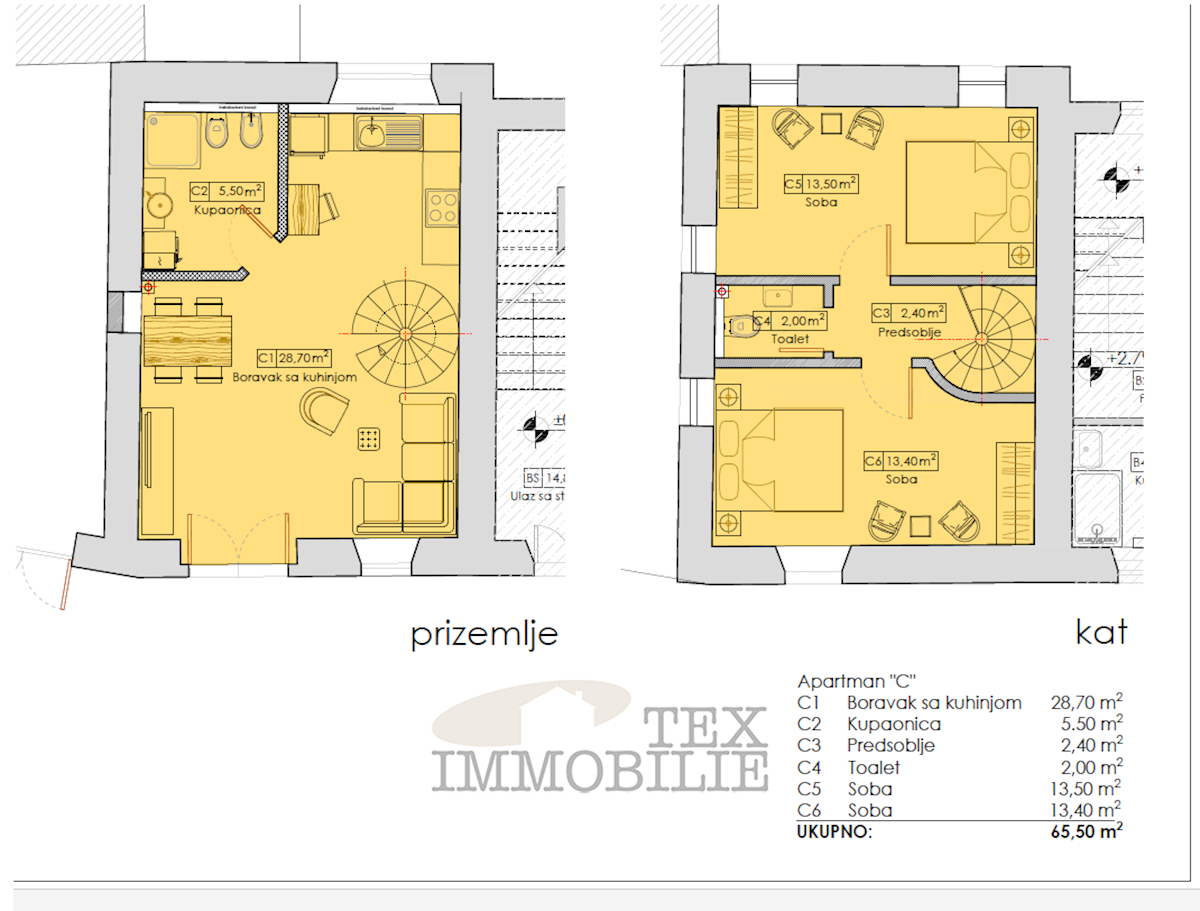 Reihenhaus aus Stein mit zwei Schlafzimmern, 65.50 m2