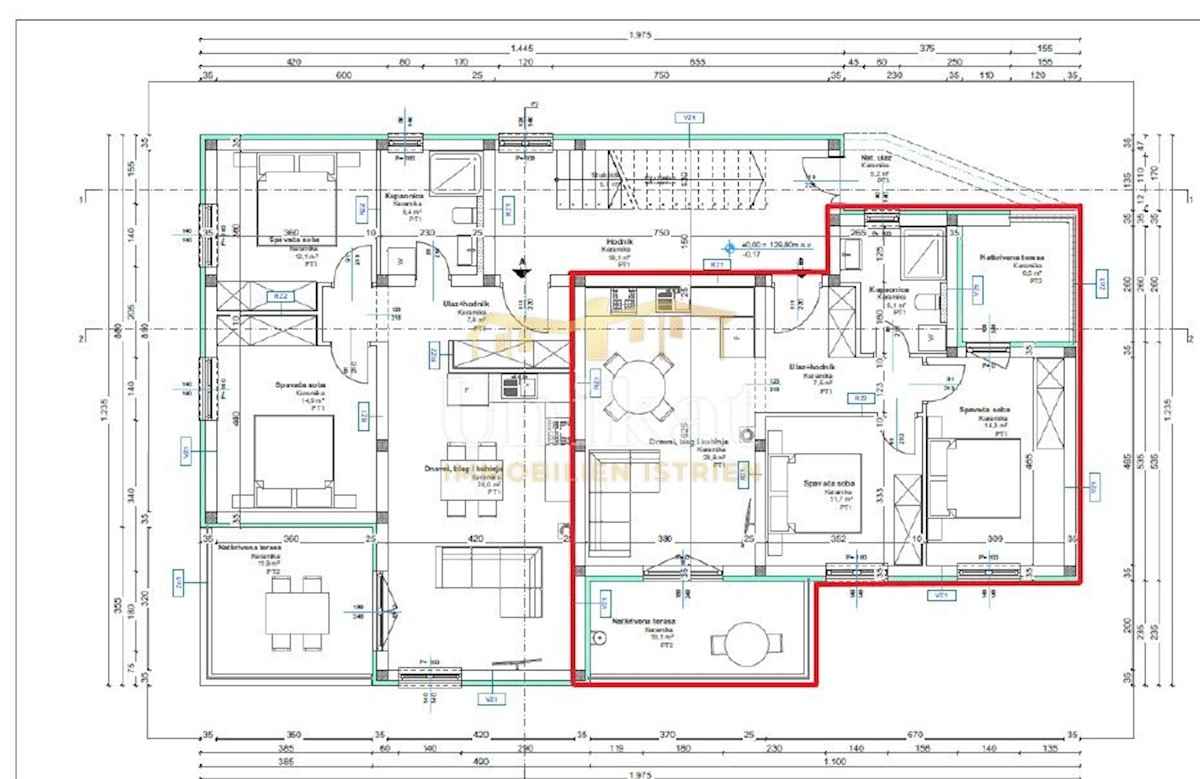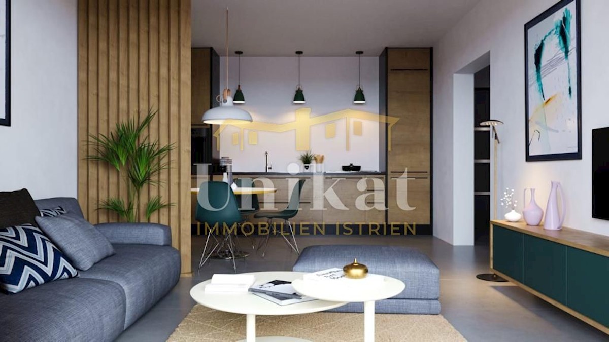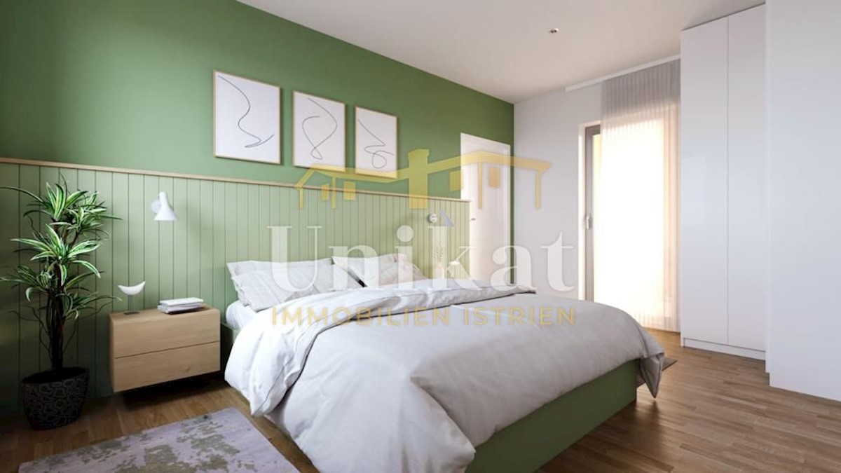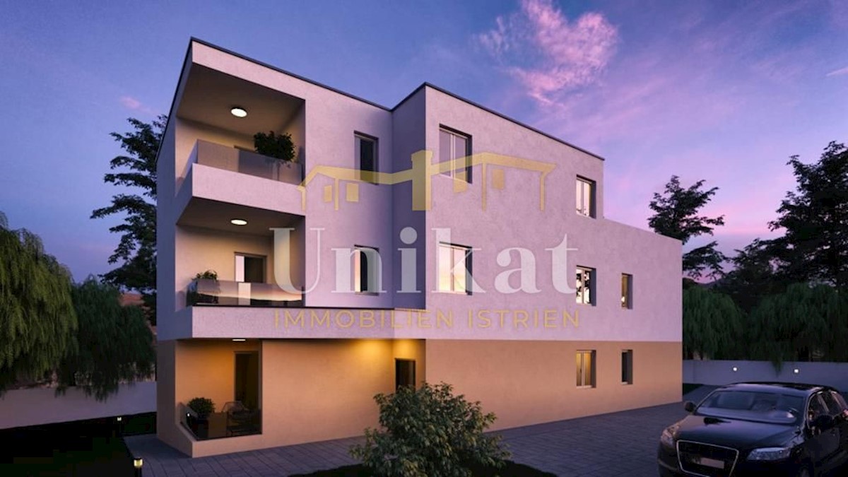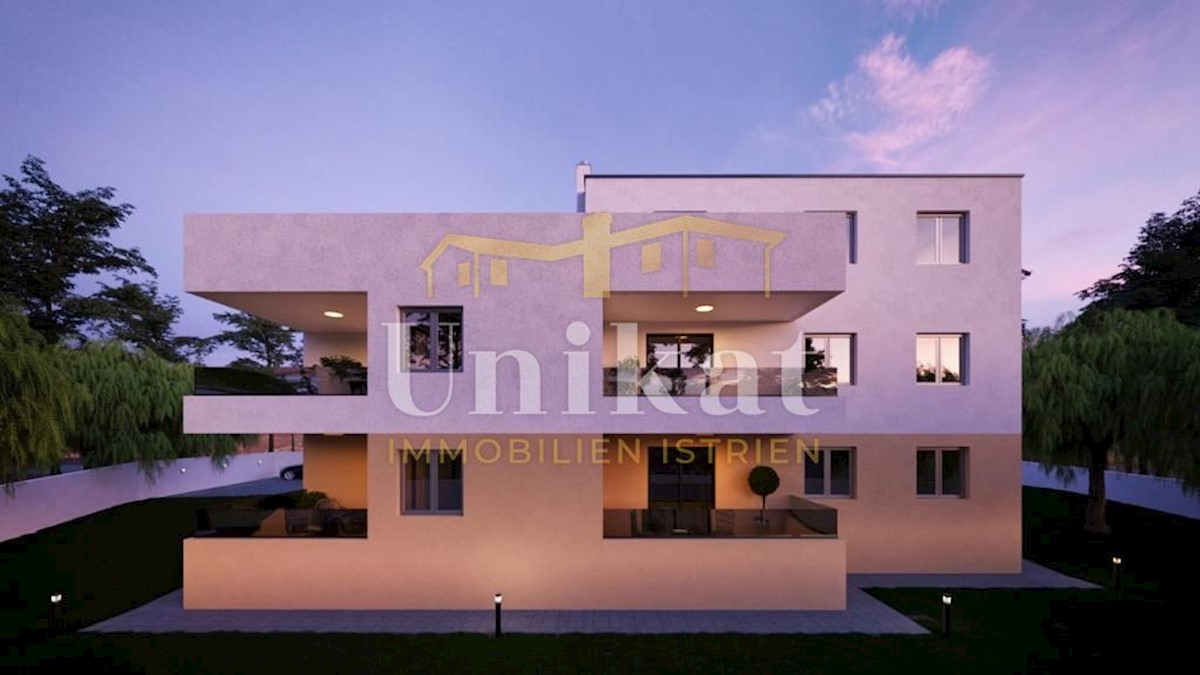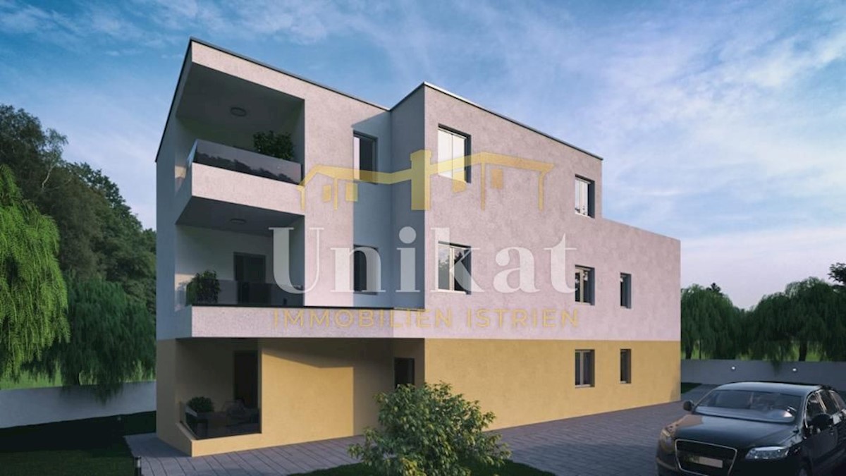 Wohnung im Erdgeschoss eines Neubaus mit insgesamt 5 Wohnungen, in einem ruhigen Ort mit guter Infrastruktur, 8 km vom Meer und ebenso weit von der Stadt Poreč entfernt. Die Wohnung besteht aus Flur, Wohnbereich mit Küche und Essbereich, zwei Schlafzimmer